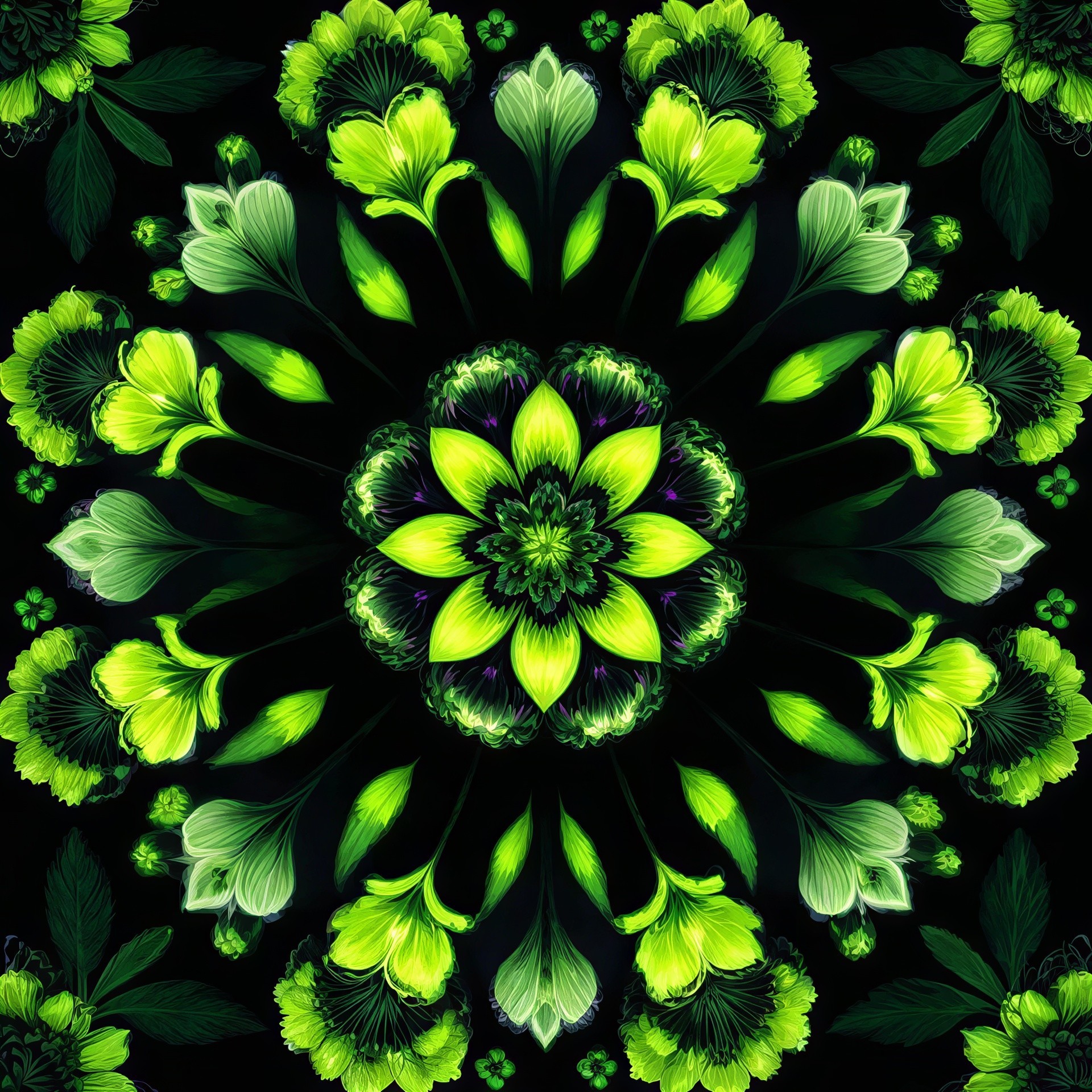 Prompt: A vibrant digital illustration features a textured dark green background filled with a repeating pattern of stylized, miniature green flowers. The flowers are uniformly spaced and rendered with a luminous glow, creating a sense of radiating warmth and energy. Subtle variations in the flower shapes and sizes add depth and visual interest, with a few slightly blurred to create a bokeh effect. The overall composition evokes a feeling of playful abundance and a clean, modern aesthetic.