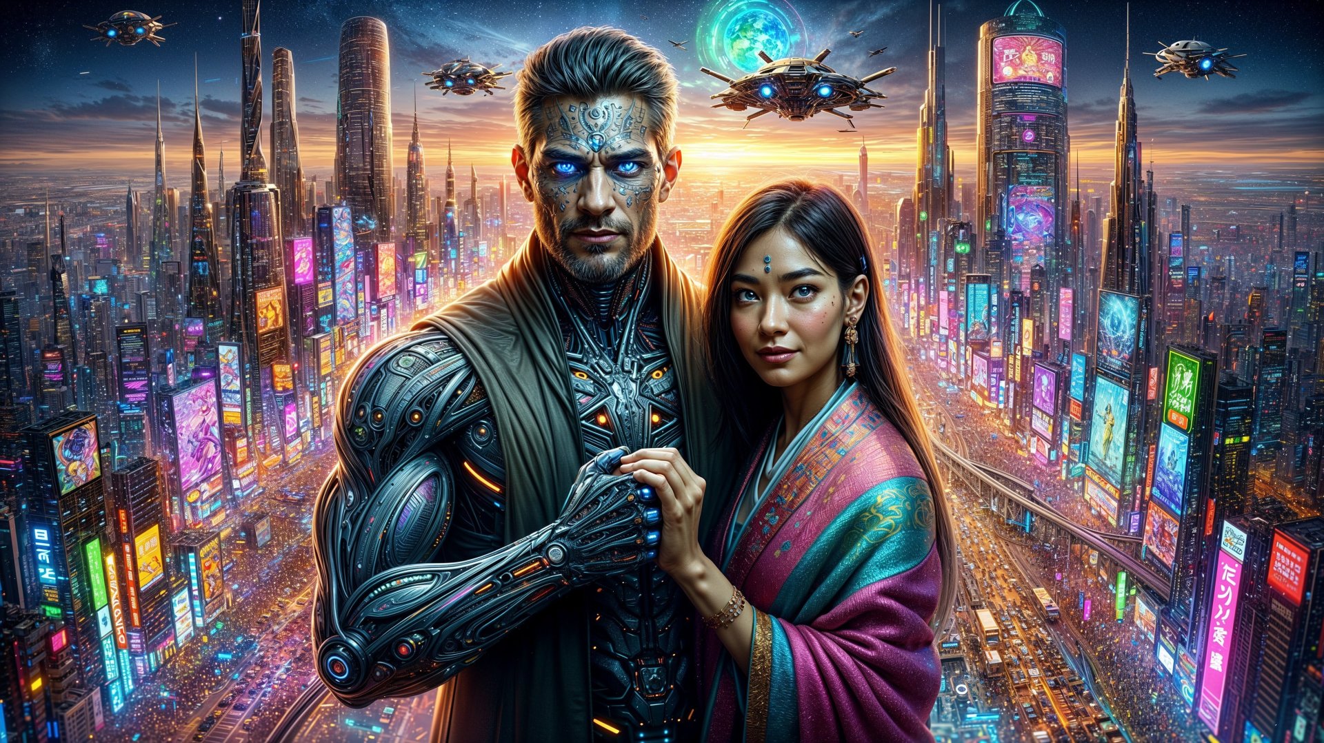 Prompt: A stunning portrait of a muscular alien man with rugged features and a beautiful woman with a gentle smile, holding hands and gazing directly at the viewer. Behind them is a breathtaking cityscape of a neo-tokyo metropolis with holographic advertisements and flying vehicles. Rendered in the style of modern digital painting, concept art, cel-shading, vibrant color palette, dynamic composition, extremely detailed, 8k.