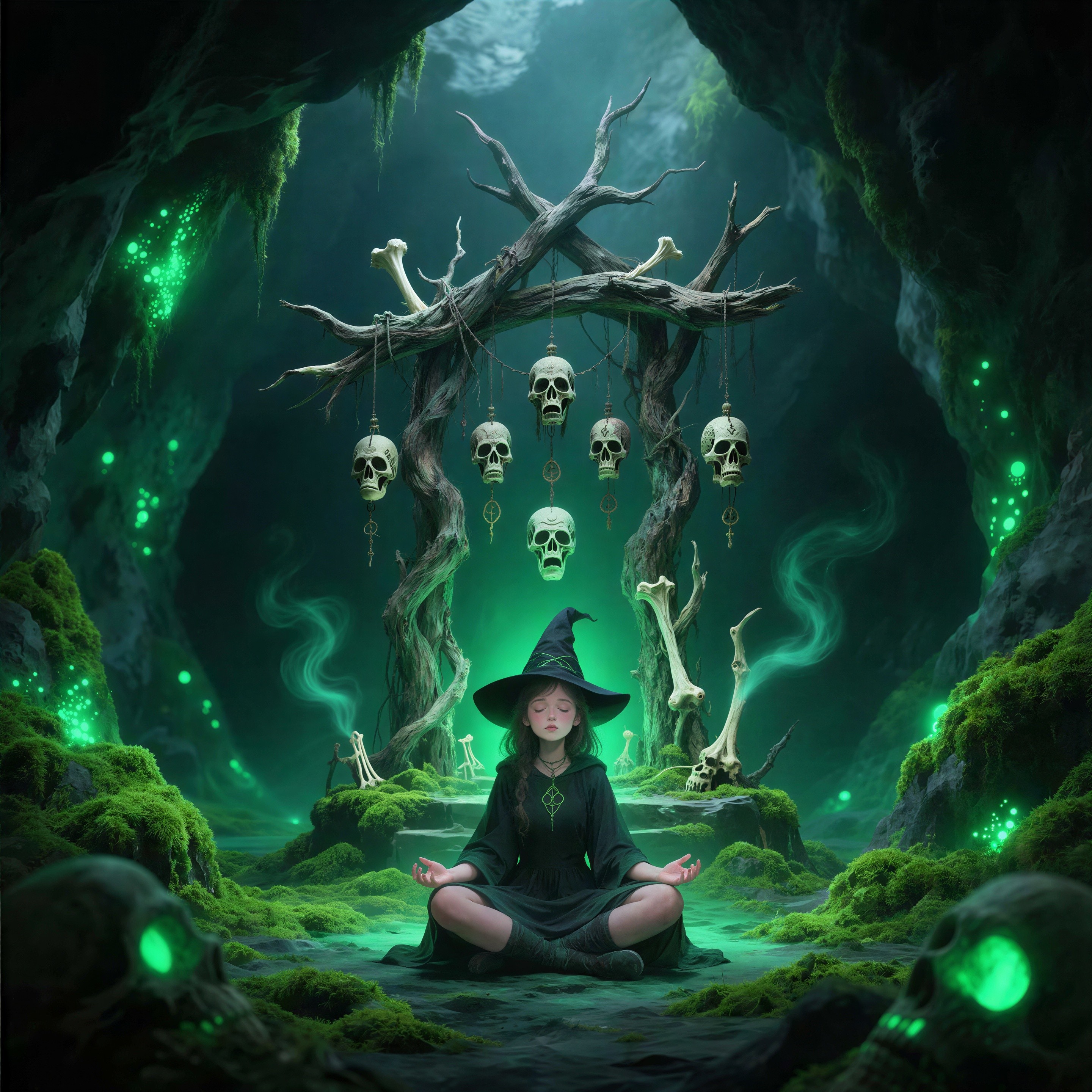 Prompt: The witch girl sits cross-legged in a glowing cave, her breath slow, her eyes closed. Bioluminescent moss pulses softly around her, casting emerald light on the shrine before her—twisted wood and bone, draped in shrunken head talismans that sway gently in unseen currents. Each head whispers secrets as she sinks deeper into trance.