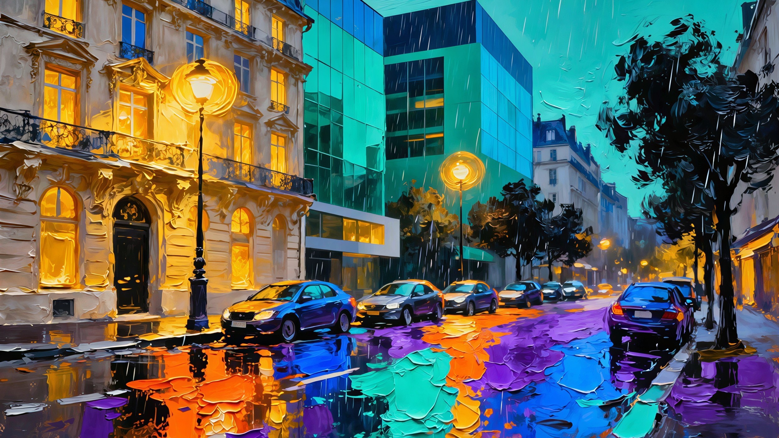 Prompt: Une rue de nuit, après la pluie. Peinture au couteau très épaisse, empâtements visibles et textures riches. Immeubles Haussmanniens au premier plan avec fenêtres éclairées d’une lumière chaude jaune-or, contrastant avec des immeubles modernes bleu-vert en arrière-plan. Lampadaires diffusant une lueur dorée, arbres sombres bordant la rue. Voitures stationnées, chaussée mouillée reflétant les lumières dans des touches vibrantes de bleu, turquoise, violet et ambre. Atmosphère cinématographique, nocturne, légèrement mélancolique, mais chaleureuse. Style semi-abstrait impressionniste contemporain, coups de couteau larges, peinture à l’huile expressive, contraste fort, impasto, chaud/froid, lumière urbaine vivante.