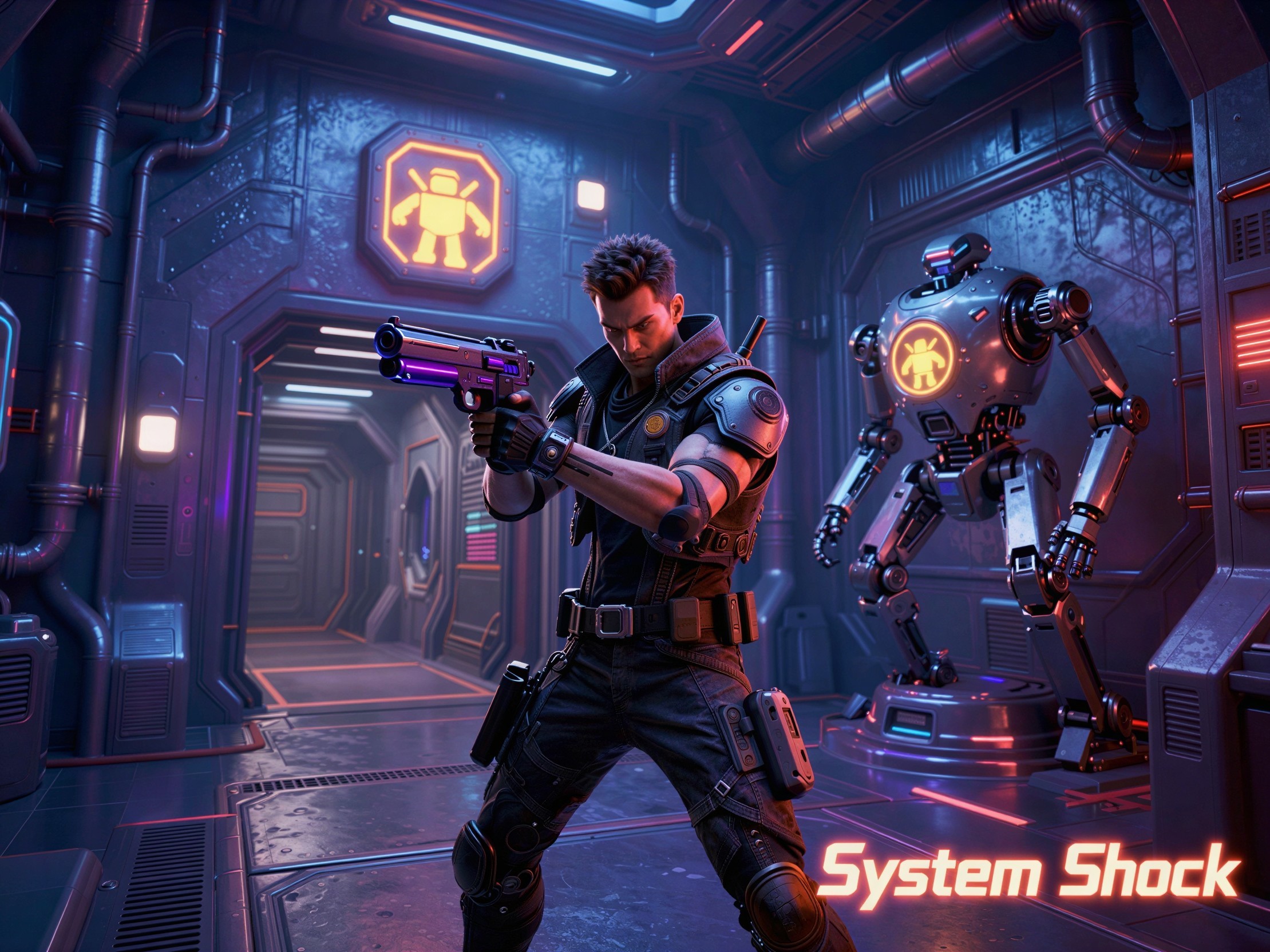 The composition includes a first-person perspective, suggesting a System Shock video game environment.