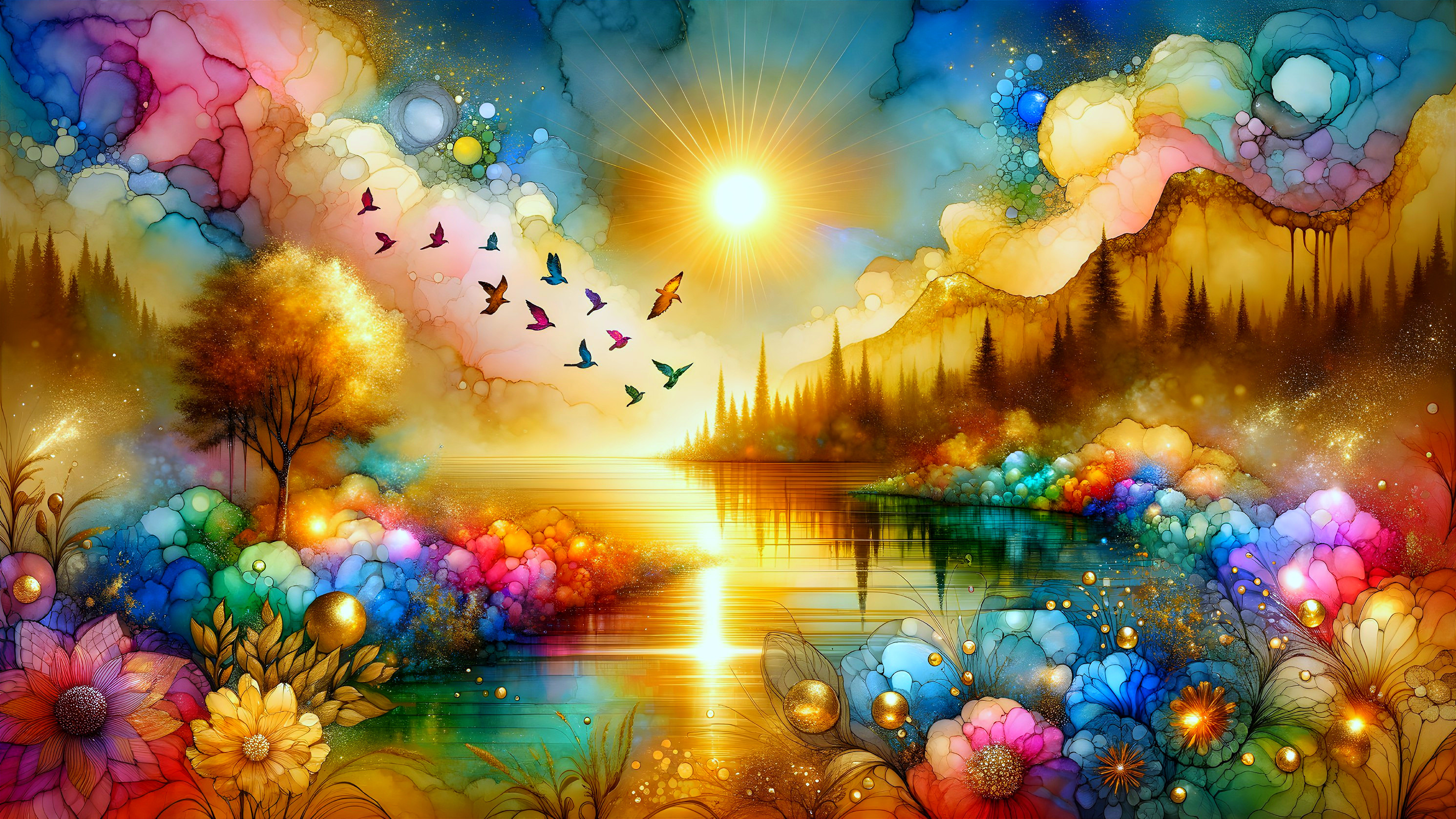 Prompt: Alcohol ink technique, golden peninsula, animated river with colorful reflections, clear blue sky, radiant sun, shimmering reflections on flowering hedges in gradient colors, multicolored birds fly through the sky and perch on a cacaoyer, a mountain to one side, warm golden light, dreamlike and mystical tickling of shimmering reflections in gradients of pinks, blues, turquoises, cyans, and magentas, sparkling, luminous, highly detailed, watercolor and various shimmering lines and shades, semi-transparent flowers of varied colors with iridescent details create to arrange the pieces of the scene, serene and celestial atmosphere, complex celestial patterns, spiritual essence, detailed and surreal, digital art, high resolution, bright gold and iridescent blues, mystical lighting, celestial, fantasycore, opalescent, iridescent, alcohol ink, pen and ink surrounded, 3D, 4K, meditative mood, calm atmosphere, large format, the scene fills the entire page in 16:9 format. Francisco de Zurbaran, Dali, Alex Gray, surreal, vivid colors, masterpiece, best quality AI art, diffuse lighting, ambient occlusion, Polished, Masterful Surrealism, Photorealistic, Translucence, pearlescent, unreal engine, 128K, UHD, crisp quality, light reflections, RHADS, atmospheric, 3D texture, 3D shading, ultra 3-dimensional effect, octane render, volumetric lighting, highest quality AI art, classic composition, rich texture and color, LSD/DMT