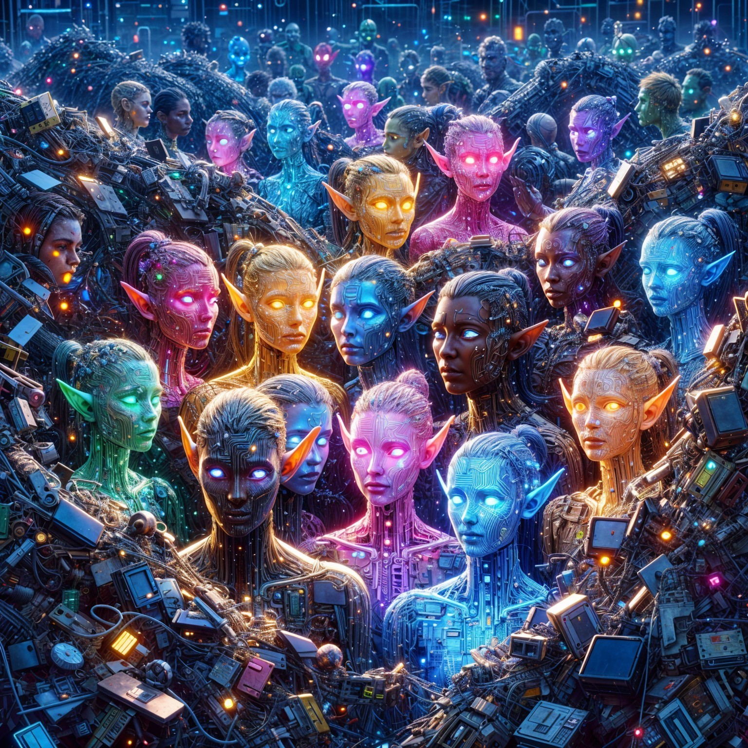 Prompt: The Elves of Cyber City—delicate beings woven from wires and dreams—gather among towering scrap metal sculptures, neon reflections dancing across their faces.