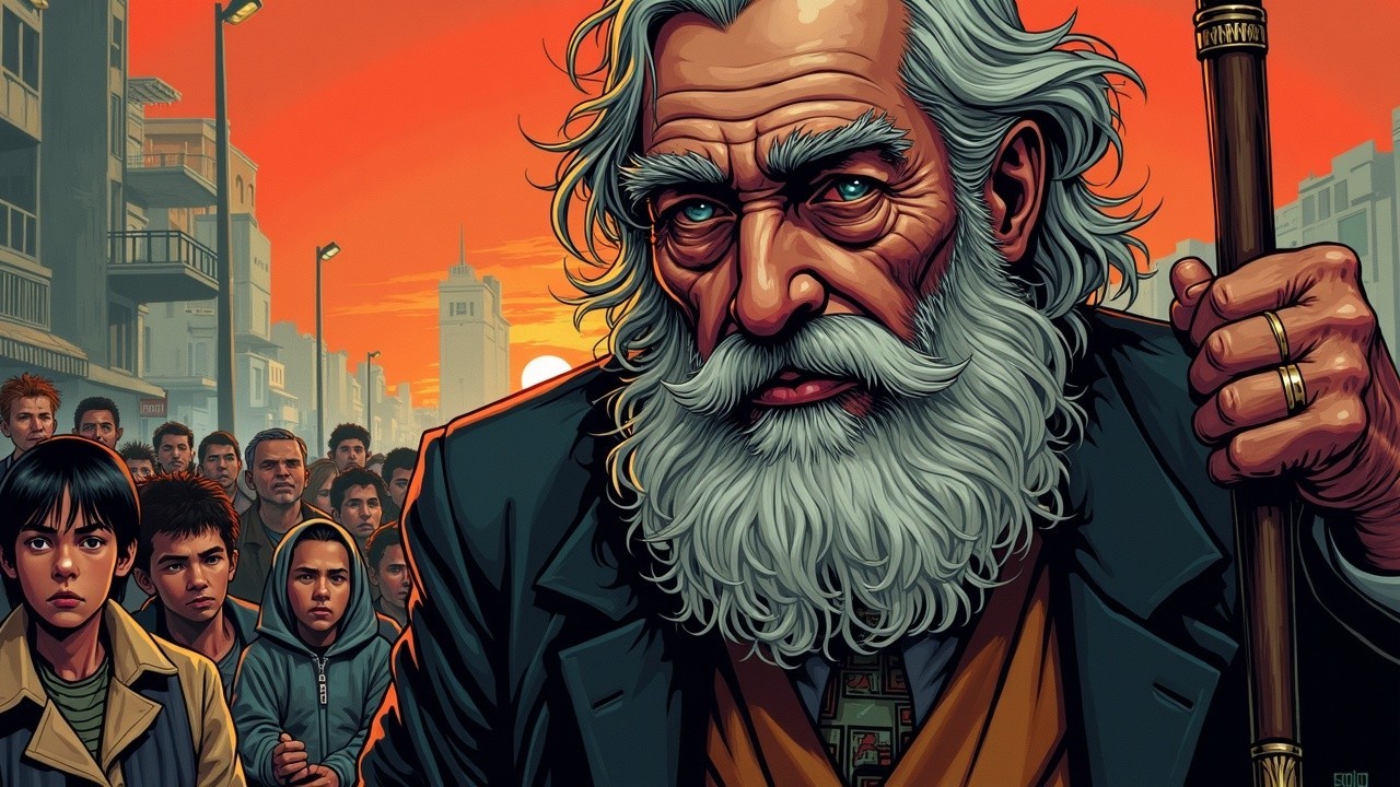 Prompt: Oligarchs ~ Tear it all down! ~ Pampered by Life: Contrast comic image of a worn rich man with a styled grey beard and cane, his facial features well kept and youthful, wearing layered suit, poor homeless children against a gritty urban backdrop with bold lines and vibrant colors, the overall aesthetic is a satirical commentary on social issues, with the old man's eyes cast downward, his face a picture of pampered easy life, cane lifted upward, adding a sense of melancholy to the scene.