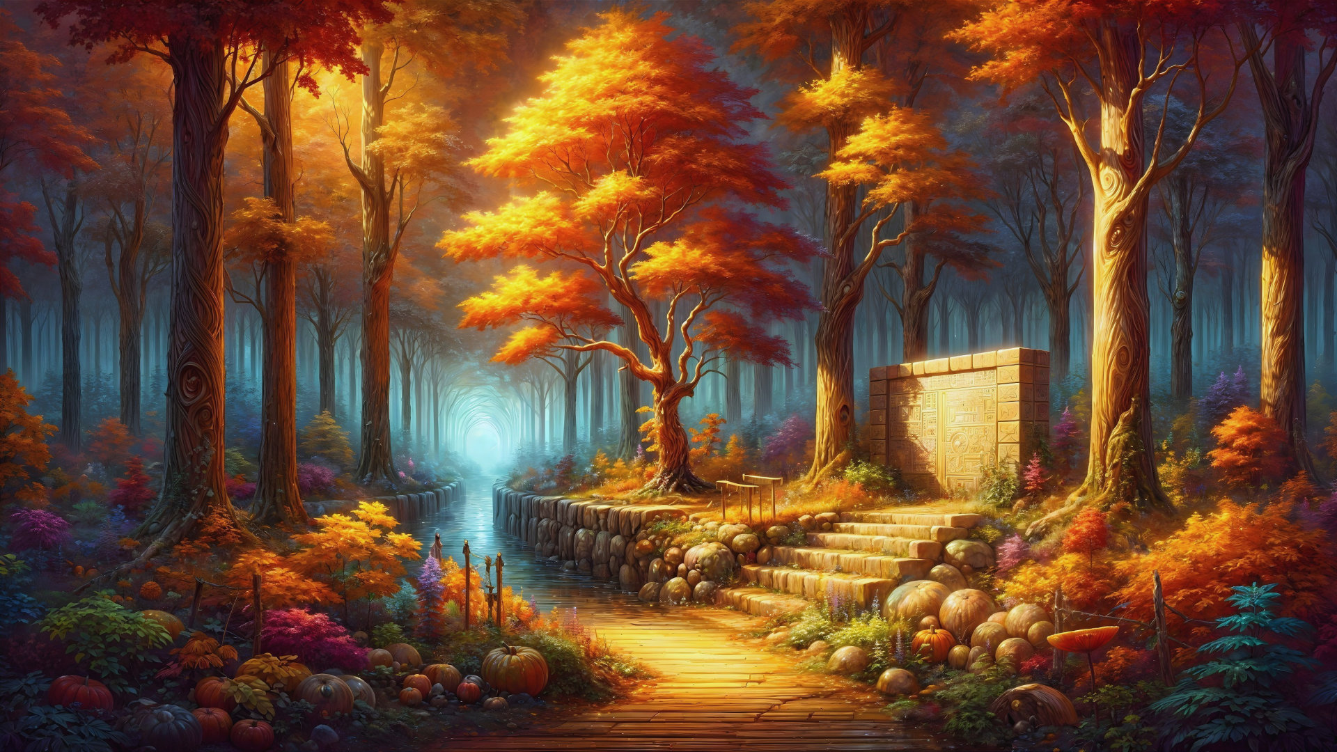 Prompt: A calm autumn scene, mysterious garden wall with a cryptic legend, enchanting atmosphere, Michael Whelan-inspired, Ivan Shishkin influence, Jacek Yerka touch, surreal elements by Micheal Cheval and Gediminas Pranckevicius, flowing energy, bright vivid colors, polished surrealism, photorealistic details, cel-shaded style, digital illustration using Unreal Engine, 64k resolution, high definition with crisp quality, light reflections creating depth, acid influence reminiscent of LSD, DMT, Mescaline, and RHADS, trippy and surreal ambiance, luminous and iridescent lighting, 3D textures with octane rendering, Nikon D850 for detailed digital painting, elegant and award-winning composition, hyperrealistic with ultra-detailed features, Van Gogh and Alex Alemany inspiration, golden ratio composition, cinematic post-processing, fantastic view with dynamic lighting.