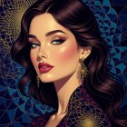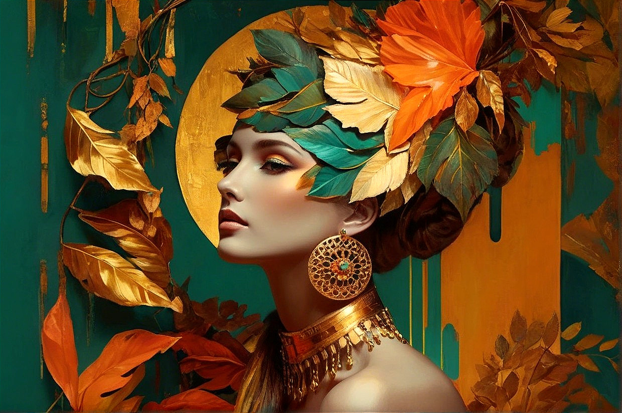 Prompt: A stunning watercolor portrait of an elegant woman with beautifully styled, intricate red or copper-colored hair, reminiscent of classical art. She has delicate features, captivating eyes, and subtle blush on her cheeks and lips. She wears a high-collared dress in a blend of deep indigo, teal, and muted green watercolor washes. Behind her, a radiant, glowing golden-orange halo or circular aura dominates the background, blending outward into soft, abstract washes of ochre, pale blue, and warm peach. The entire piece should exhibit the fluid, translucent quality of watercolor, with visible brushstrokes and natural blending, creating a harmonious contrast between warm background tones and cool foreground attire. The style is sophisticated, serene, and painterly, with a dreamlike, ethereal quality.