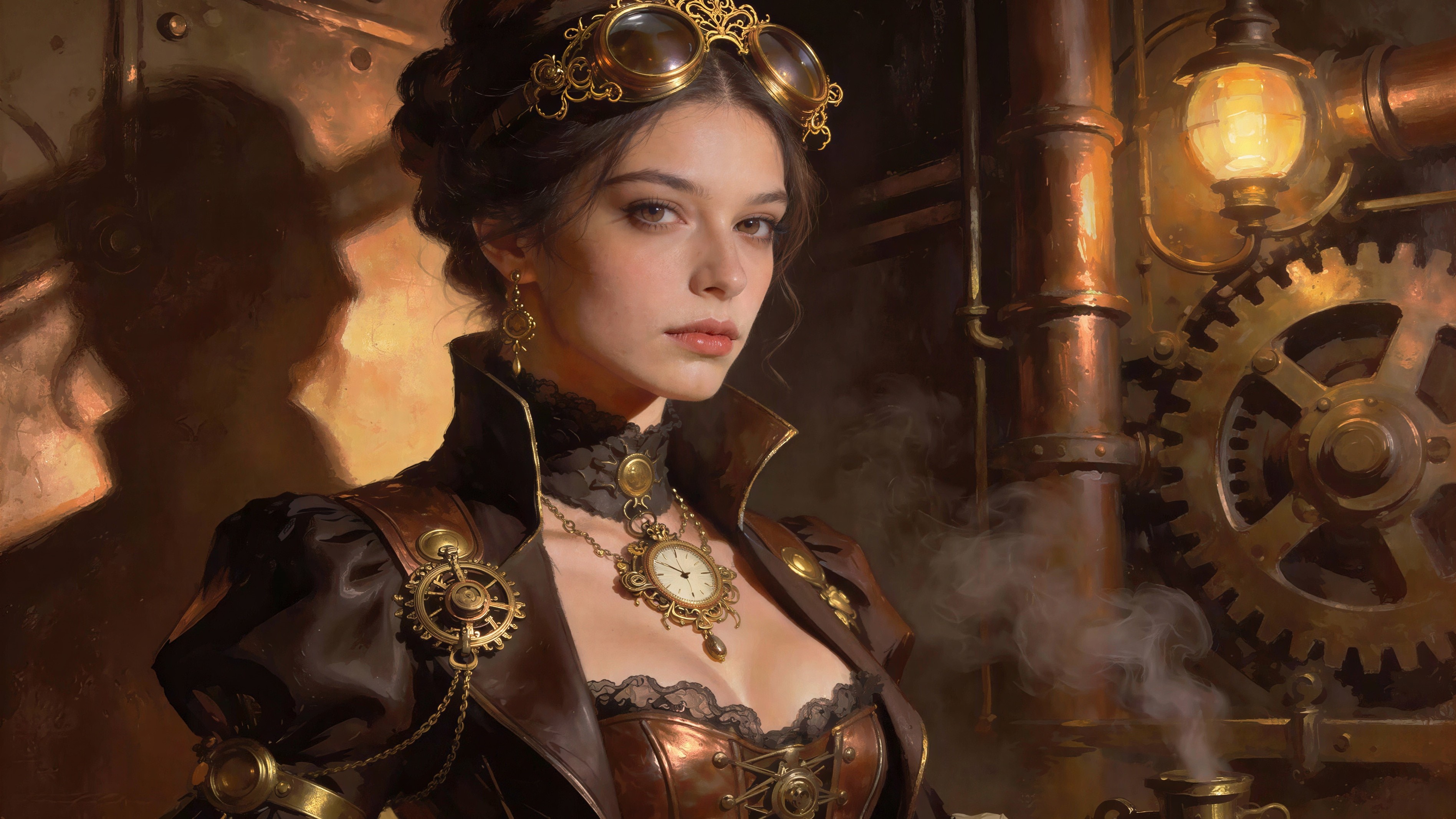 Prompt: A painterly digital painting of an exceptionally beautiful woman, portrayed with timeless elegance and refined features, set entirely within a richly imagined steampunk universe. Her face is harmonious and radiant, with expressive eyes, porcelain skin, and a calm, confident gaze that conveys intelligence and mystery.