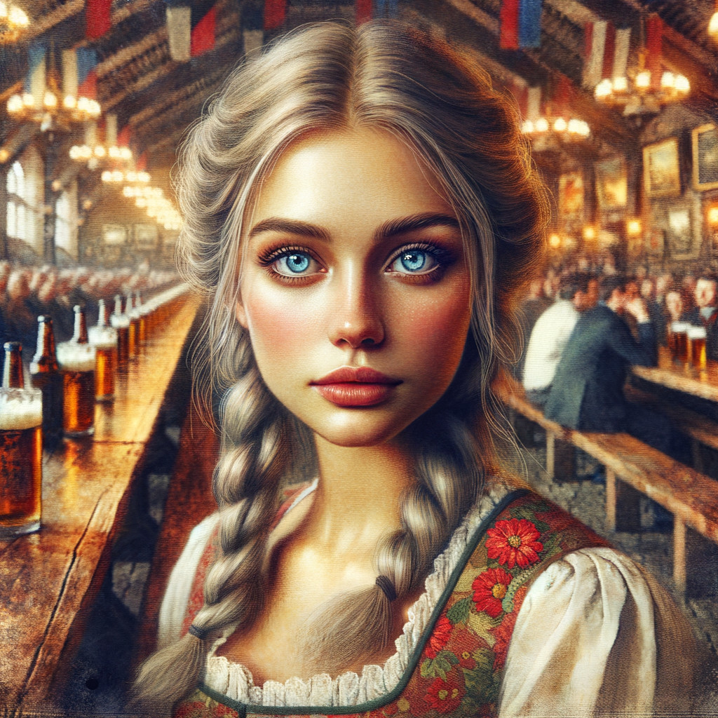 Prompt: An enchanting, grunge-textured portrait of a young German Beauty at Beer Hall, with blonde hair, clear face without artefacts, beautiful realistic blue eyes, aquarelle patchwork, autumnal touch, in the style of Richard Burlet, Anna Dittmann, Botticelli, Picasso, Meghan Duncanson, Didier Lourenço and Daniel Merriam, highly detailed, intricate, imperial colours, by Susanne, cinematic postprocessing.