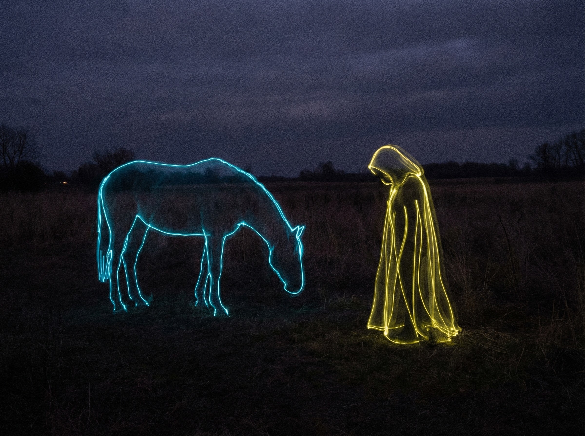 Prompt: Realistic photo of a horse on the left with a transparent body outlined in neon blue the body. The horse's form is detailed, with visible contours and a slightly lowered head. On the right, a human figure stands, rendered in a similar style but with vibrant outlined yellow lines, giving the impression of a flowing dress or cloak. The figure's head is slightly bowed, and the face is obscured, adding a sense of mystery. The background is a dark field. The overall mood is enigmatic and otherworldly, with a strong contrast between the vivid colors of the figure and the subdued tones of the background