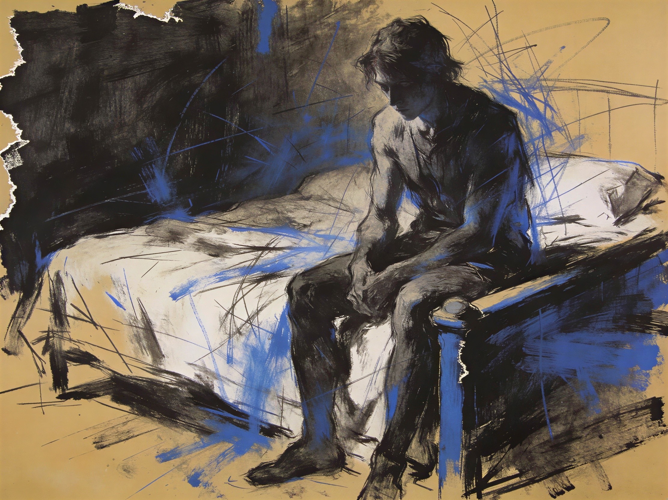 Prompt: Abstract unfinished charcoal sketch: A brooding figure sitting on the edge of a bed, executed in chaotic cobalt strokes of varying densities. The dark ochre background, the disturbing atmosphere, and the lines create a sense of inner tension and instability.