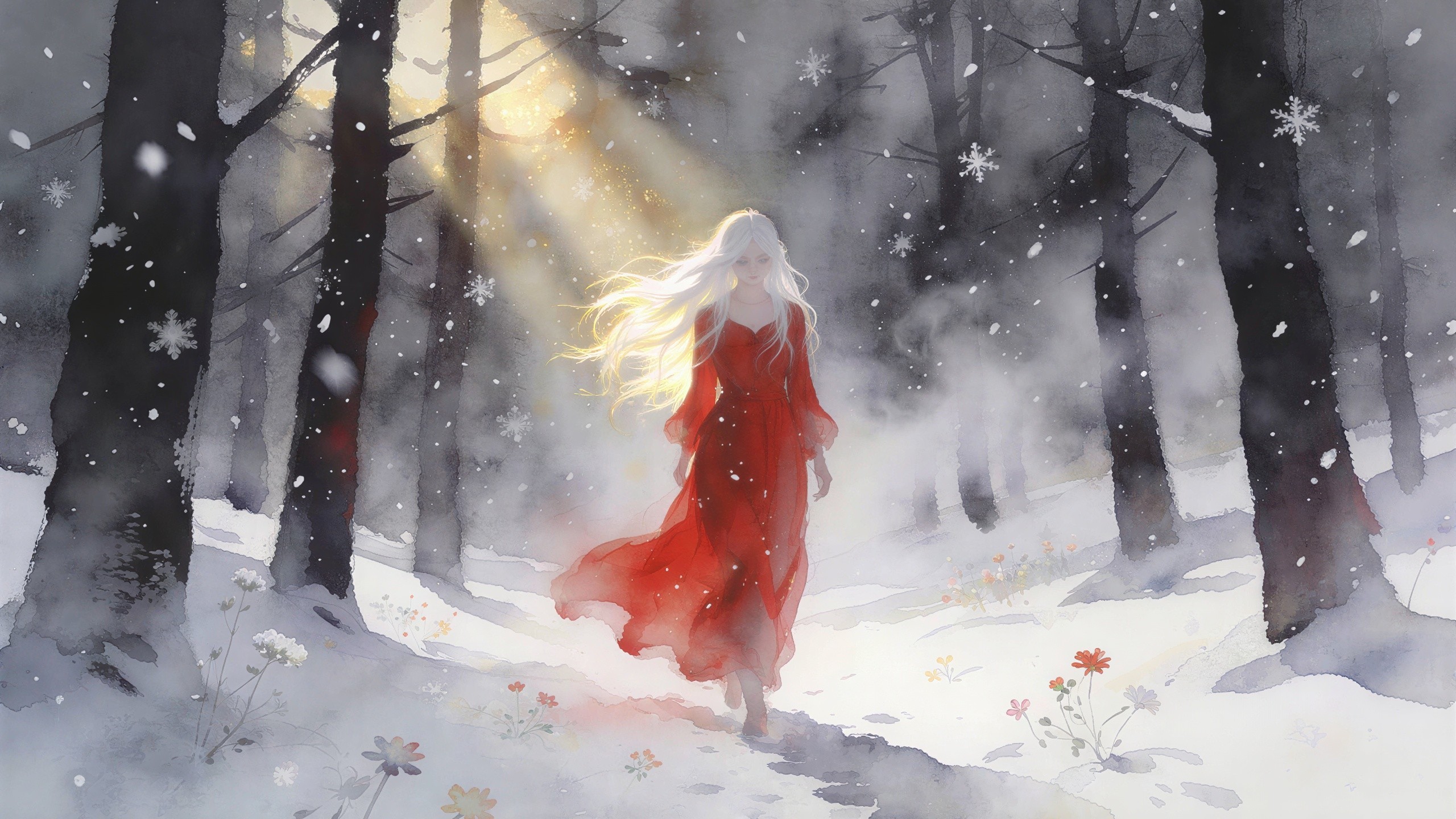 Prompt: Paint a dreamy hazy breezy wet on wet watercolor artwork, using minimal paints and maximum loose water effects, winter color palette, melancholy composition, minimalist, impressionist, a mysterious ethereal beautiful young woman with long windswept white hair in a flowing red dress walks in a snowy forest, surrounded by tall, shadowy trees. Weak but gorgeous pale gold sunbeams illuminate her long flowing white hair. The scene is ethereal, with soft falling snowflakes creating a dreamlike atmosphere. The background is filled with blurred greys and whites, evoking a sense of depth and tranquility. The woman’s face is obscured, adding an air of intrigue and solitude. The overall color palette combines soft pastels with vibrant reds, enhancing the contrast between the cloaked figure and the serene white winter landscape.
