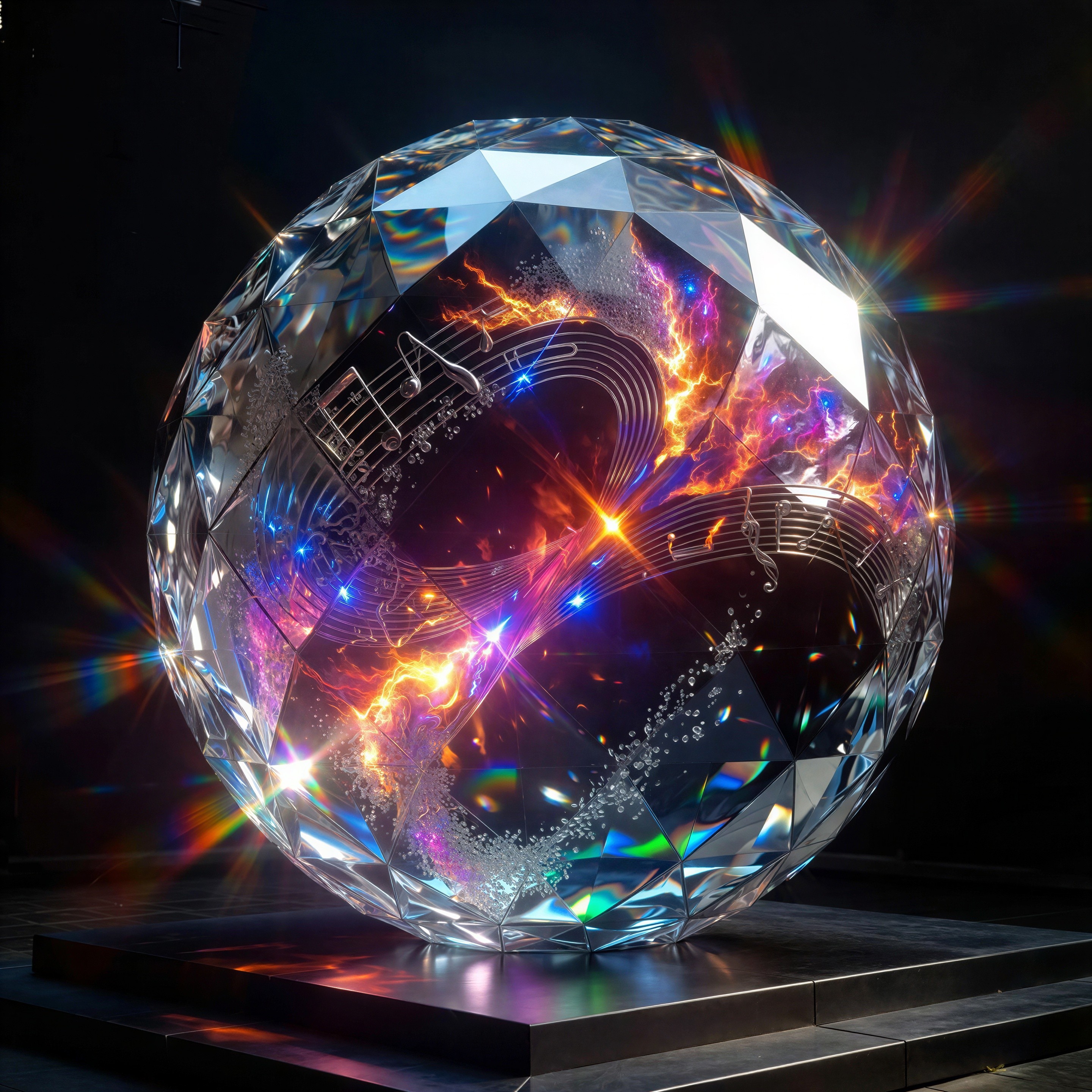 Prompt: Glistening Crystal Jupiter of Musical Harmony—a radiant, crystalline orb pulsating with the raw fury of symphonic ecstasy, its flawless facets etched deep with swirling musical notes that scream of passion's untamed crescendo! Light shatters across its gleaming surface in defiant prisms of iridescent fire, igniting a sleek modern sanctum where art and melody collide in a cataclysmic embrace of transcendent beauty. This is no mere sculpture; it is the throbbing heart of harmony's eternal storm, demanding reverence, evoking tears of awe-struck longing.black background