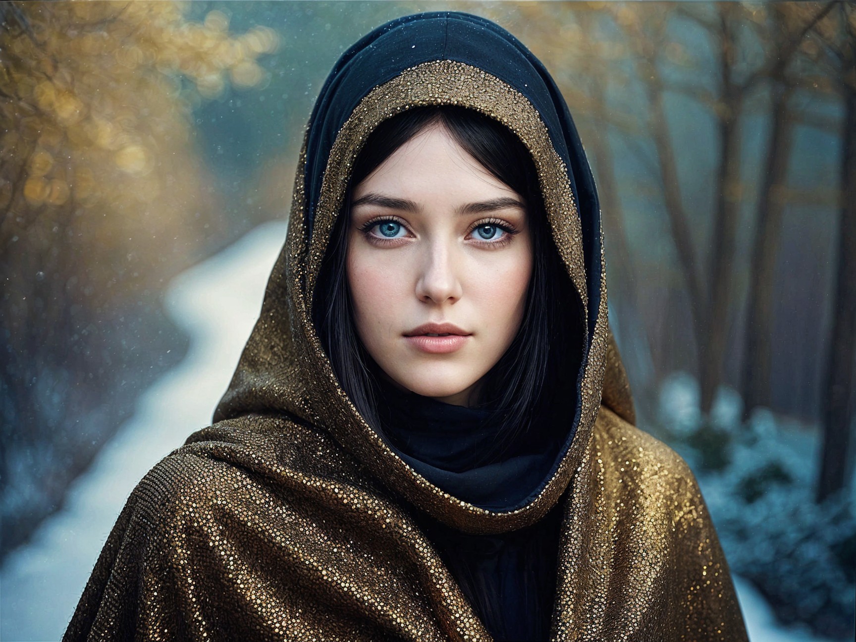 Prompt: surreal portrait of girl in golden,black embroidered attire,whimsical elements,against dreamy winter scenery,soft hues and optical glitch effects;inspired by Paul Klee,incorporating pointillism,digital artistry with pixelsorting techniques;highly detailed,8k resolution,light painting,analog errors,visual symphony,meticulous craftsmanship like kintsugi,abstract expressionism
