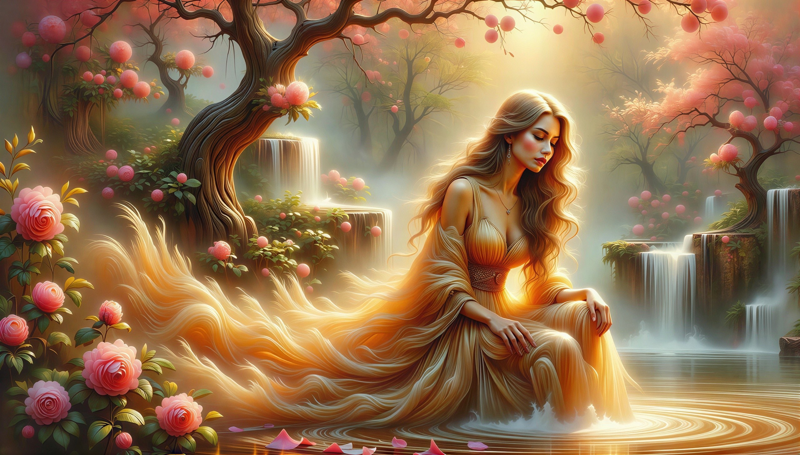 Prompt: A beautiful woman with long, flowing golden hair, wearing an ornate, shimmering, low-cut golden gown with intricate lace and embroidered floral patterns, sitting gracefully on the edge of a stone fountain, looking upwards and smiling serenely. The fountain has clear blue water with a powerful jet, surrounded by lush green foliage and an abundance of vibrant pink roses in full bloom, arching overhead and in pots, with scattered rose petals on the stone path, In a magical garden with a grand fountain and archways. Fantasy Art, Digital Painting Illustration, ethereal sunlight with dramatic rays shining through the overhead roses, creating a luminous and magical glow, soft shadows, Medium shot, full body, centered, slightly tilted up to capture the woman's beautiful eyes and the overhead roses, depth of field. Intricate details on the golden gown, dewdrops on rose petals, sparkling water in the fountain, shimmering light effects, dreamlike atmosphere, rich textures,