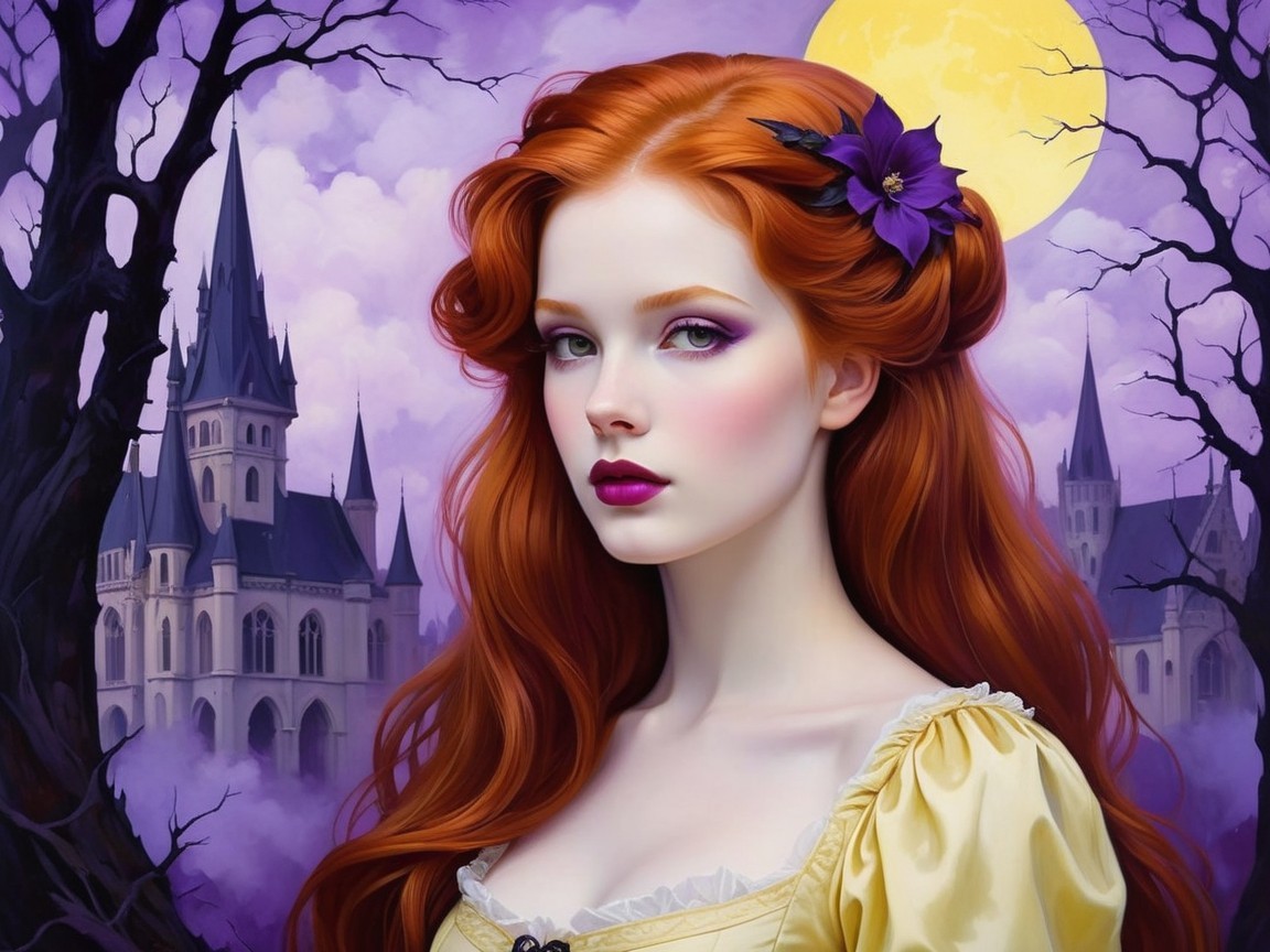 Prompt: A dreamlike portrait in watercolor, chalk, oil, and hand-painted wet-on-wet, depicting an elegant young woman in profile. Her long, curly, reddish hair cascades down her back, adorned with a large, pristine white flower. Her head is tilted slightly, and her gaze, lowered with a serene expression, evokes a quiet elegance. She wears a flowing, luminous pink dress that seems to glow with pastel hues. The background is a layer of soft, muted tones—peach, blush, and ivory—that blend seamlessly with delicate brushstrokes, creating an ethereal and romantic atmosphere with intricate painterly details.
