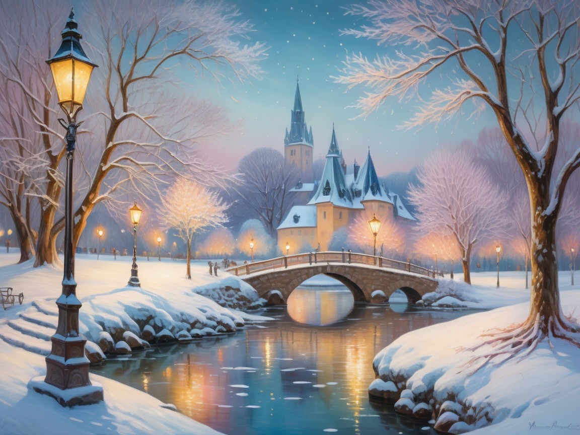 Prompt: A breathtakingly beautiful, highly detailed, panoramic winter landscape in the style of impressionism, reminiscent of Claude Monet and Berthe Morisot. A medieval park is covered in frost, with intertwined tree branches resembling clasped hands. Pastel colors create a dreamy, cozy evening mood illuminated by romantic bioluminescent lantern light and a symphony of playful, ethereal lights. Transparent, crispy snowflakes slowly descend, dancing and spinning in the wind. In the distance, a city with gothic church towers is visible. Reflections on the pristine snow enhance the atmospheric splendor. Super resolution, sharp focus, 8k resolution, perfect shapes.