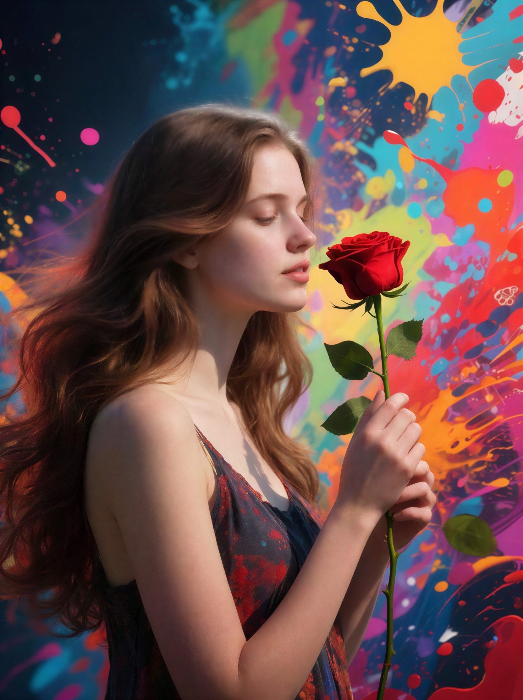 Prompt: A stunning young brunette woman with flowing hair, holding and admiring a single red rose stem. Colorful abstract background with vibrant splatters and intricate details, rendered in a hyperrealistic, concept art style. Mid shot, 2/3 face angle, illuminated by dramatic side lighting, accentuating the color depth and emphasizing the subject's beauty. Inspired by the dynamic energy of splash art.