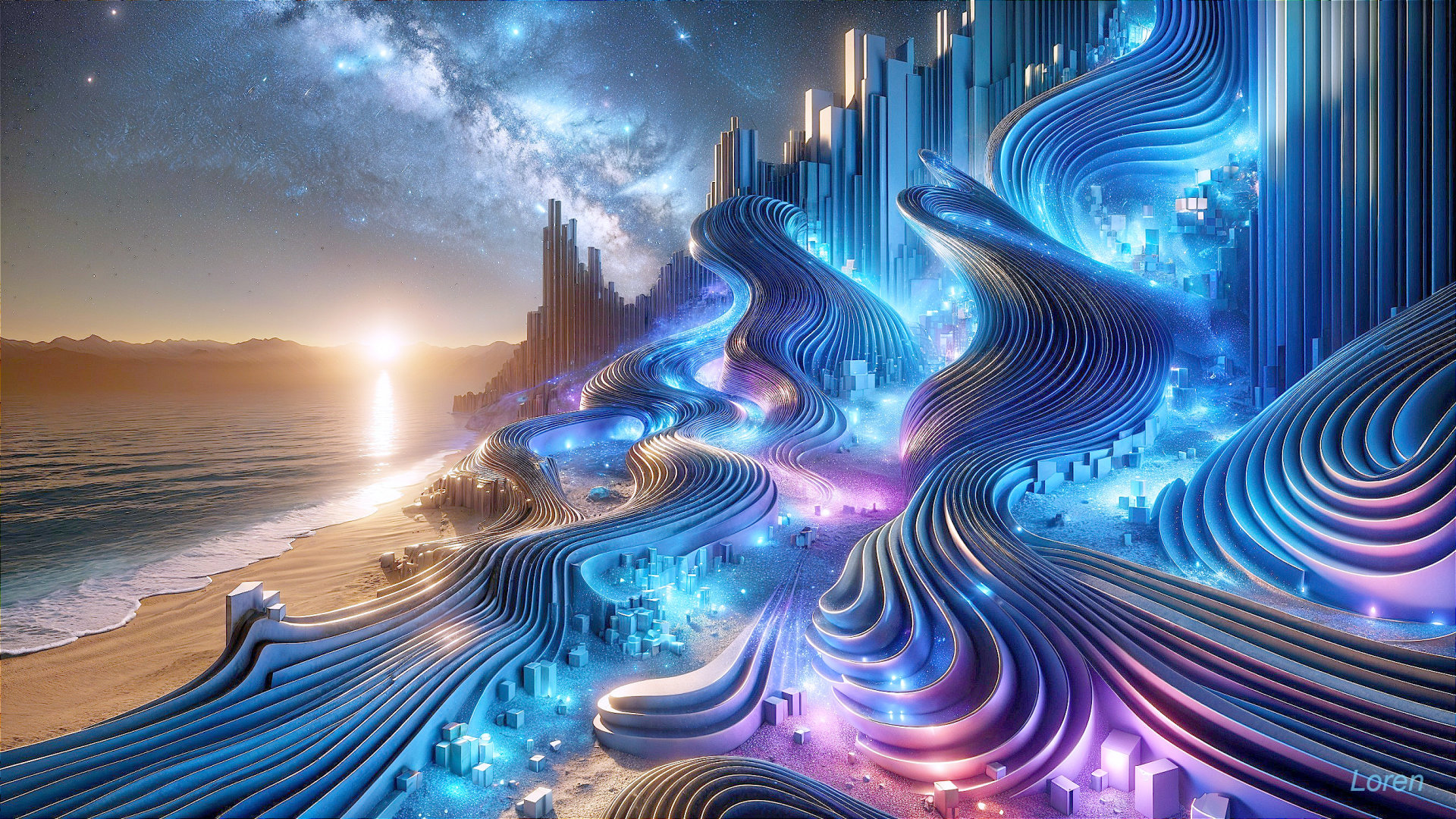 Prompt: A special key artifact of alien origin worthy of attention. no more than one building,no text,not a blue sky, Waveform Oasis: A Technicolor Dream. Vision of Futuristic Beauty. Beneath starry sky where dreams ignite, The Waveform Oasis shimmers bright— A symphony of layered waves arise, Dancing boldly beneath surreal skies. Walls ripple in vibrant neon streams, Cobalt, magenta, and emerald gleam. Curves embrace the ocean’s gentle sweep, Where future and fantasy softly meet. Upon the sunlit, otherworldly sand, This technicolour marvel proudly stands. An echo of tomorrow, wild and free— A haven for the mind’s creativity. So gaze in wonder, let your spirit roam— In Waveform Oasis, find your technicolour home. Captivating, modern aesthetic, harmonious A masterpiece of abstract mosaic cubism with elements of pastel painting. Mosaic fragments shaped like medium size puzzles. Lyrical atmosphere. Full-size image.
