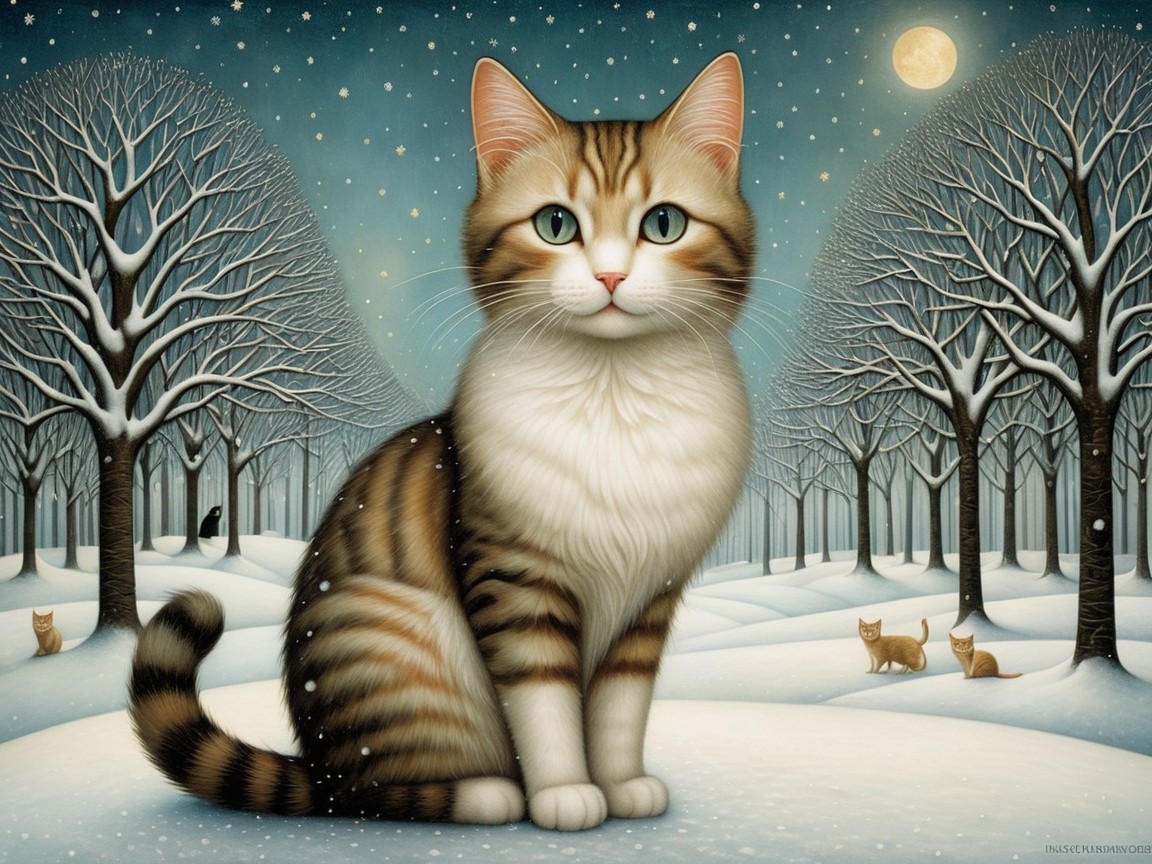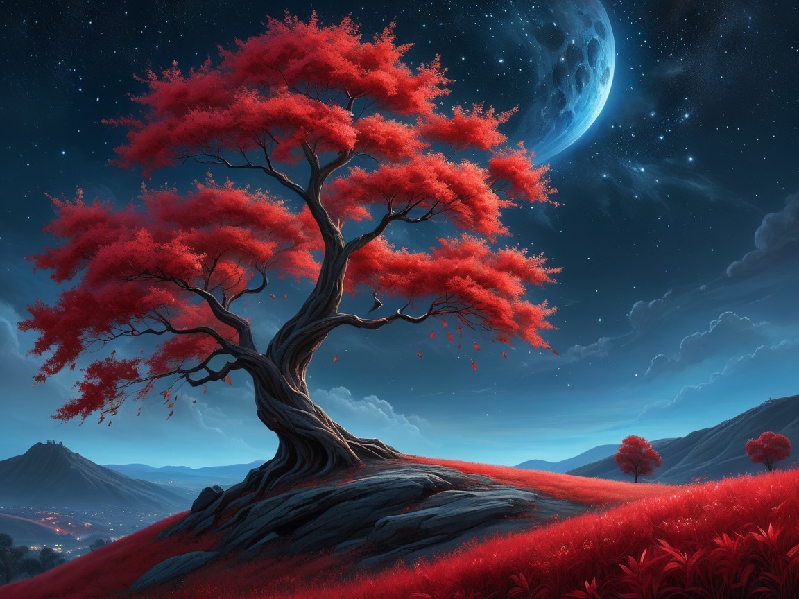 Prompt: A digital art illustration of a vintage red and white classic car in a winter Christmas setting. The car has glowing headlights, a classic round front grille, and warm interior lighting visible through the windows. The car is positioned on a snowy street with tall, perfectly symmetrical Christmas trees lining both sides. The trees are covered in snow and decorated with small red ornaments. The background features a dark teal-colored building facade with warm yellow lights visible through windows. The overall scene has a moody, atmospheric quality with a teal and orange color palette. The snow on the ground creates subtle shadows and reflections under the bus's lights. The composition is centered with the car taking up the middle third of the image, while the Christmas trees create a natural frame on both sides. The lighting creates a warm glow from within the car contrasting with the cool tones of the winter night setting.