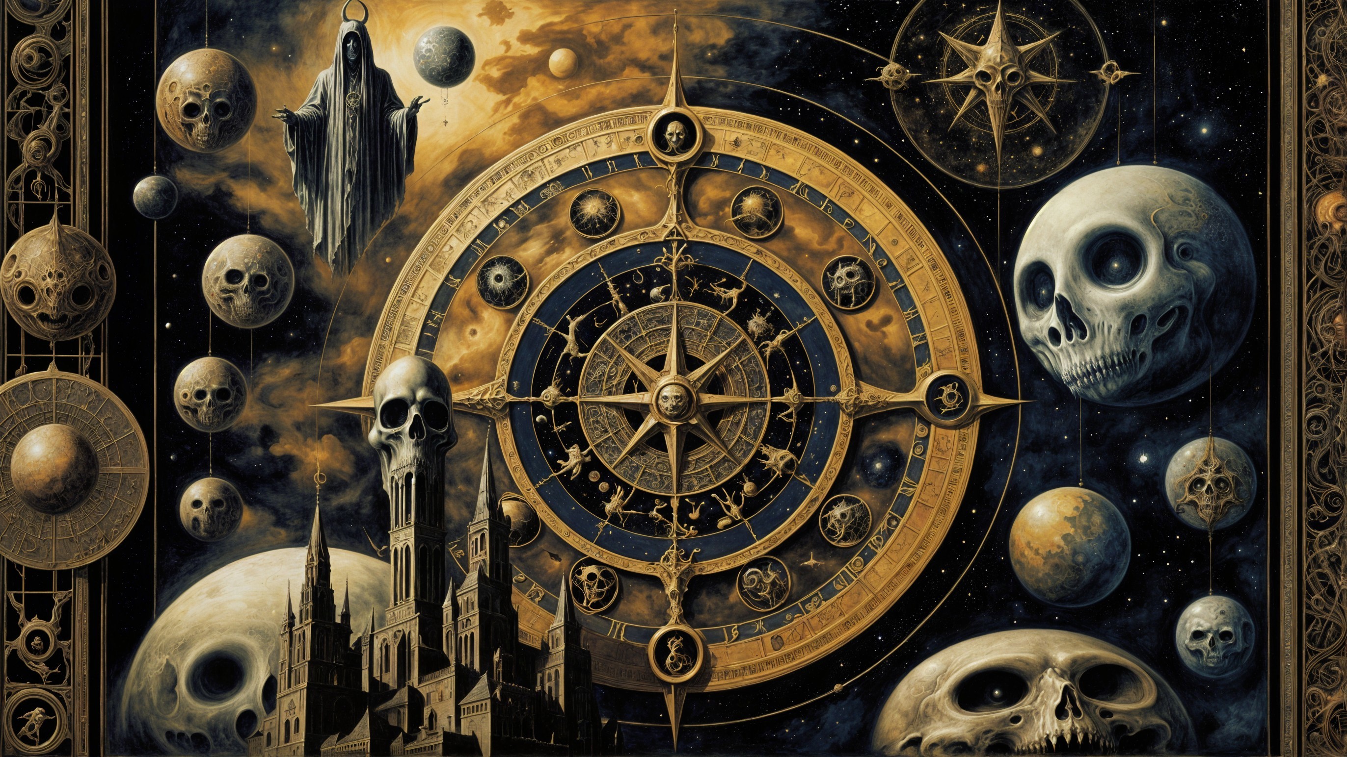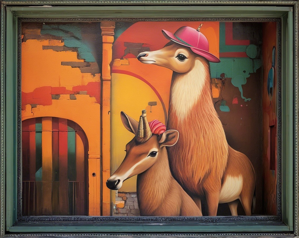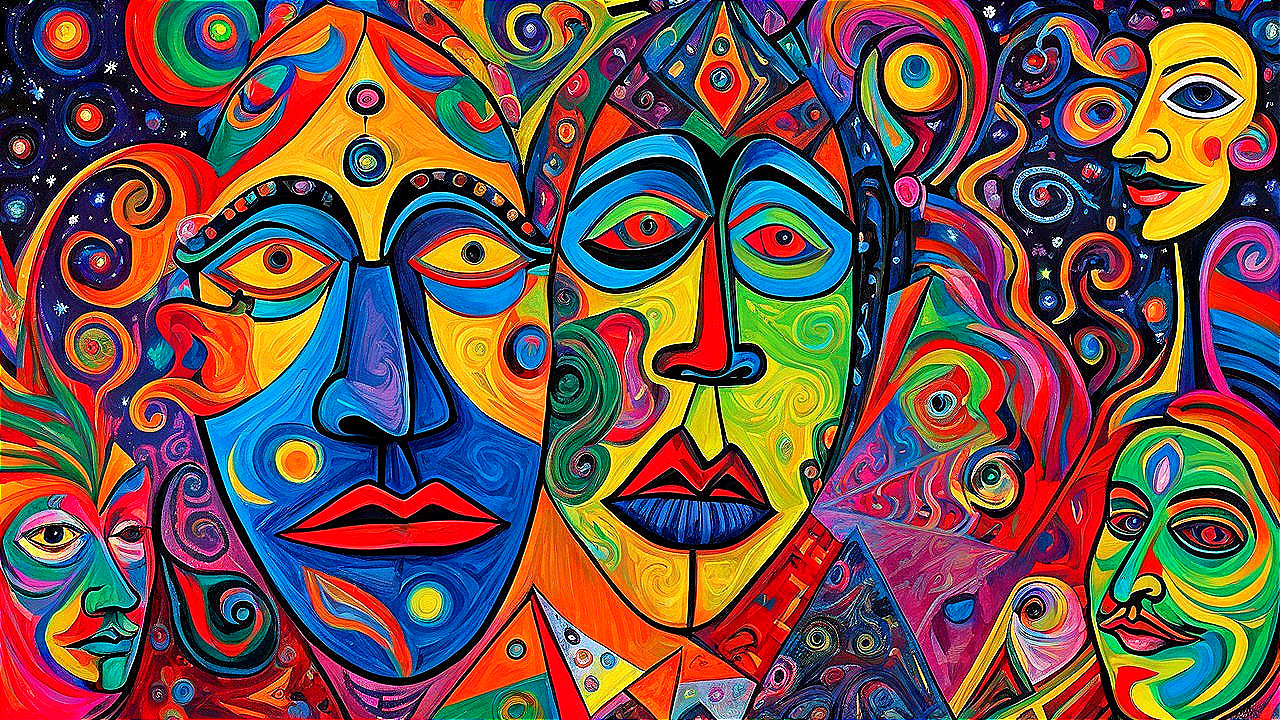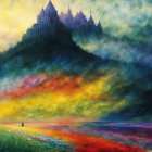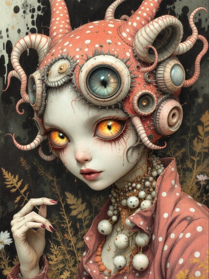 Prompt: Monstrous painting of a terrifying, colourful eye is reflected in the eye of a horrific werewolf. Moody, scary, weird and wonderful. Misty edges to the painting frame.