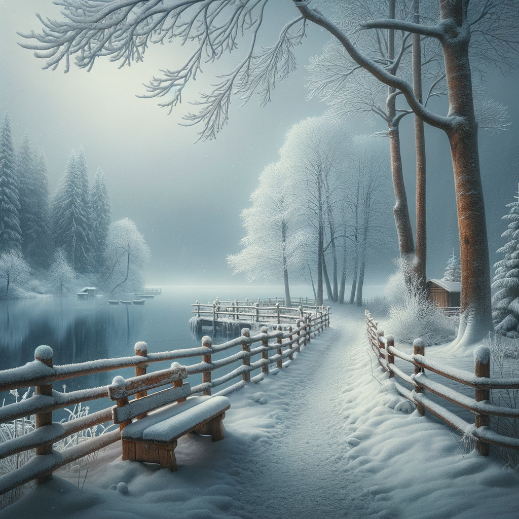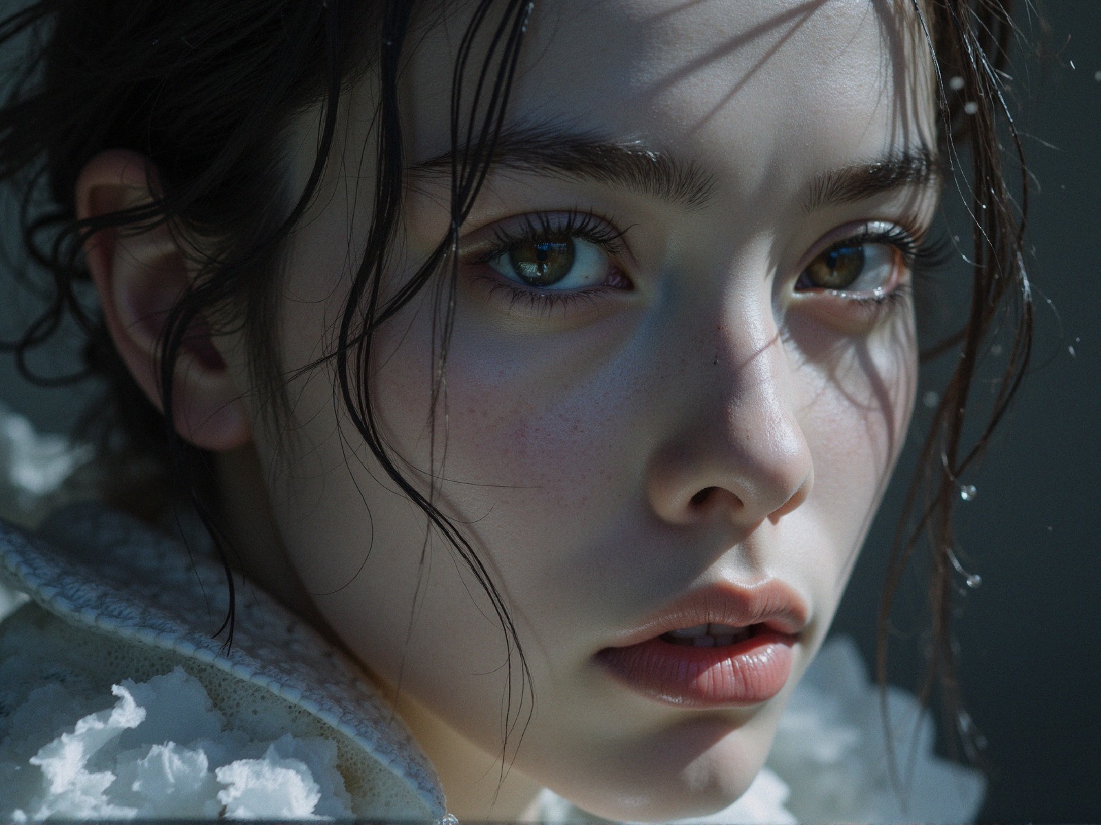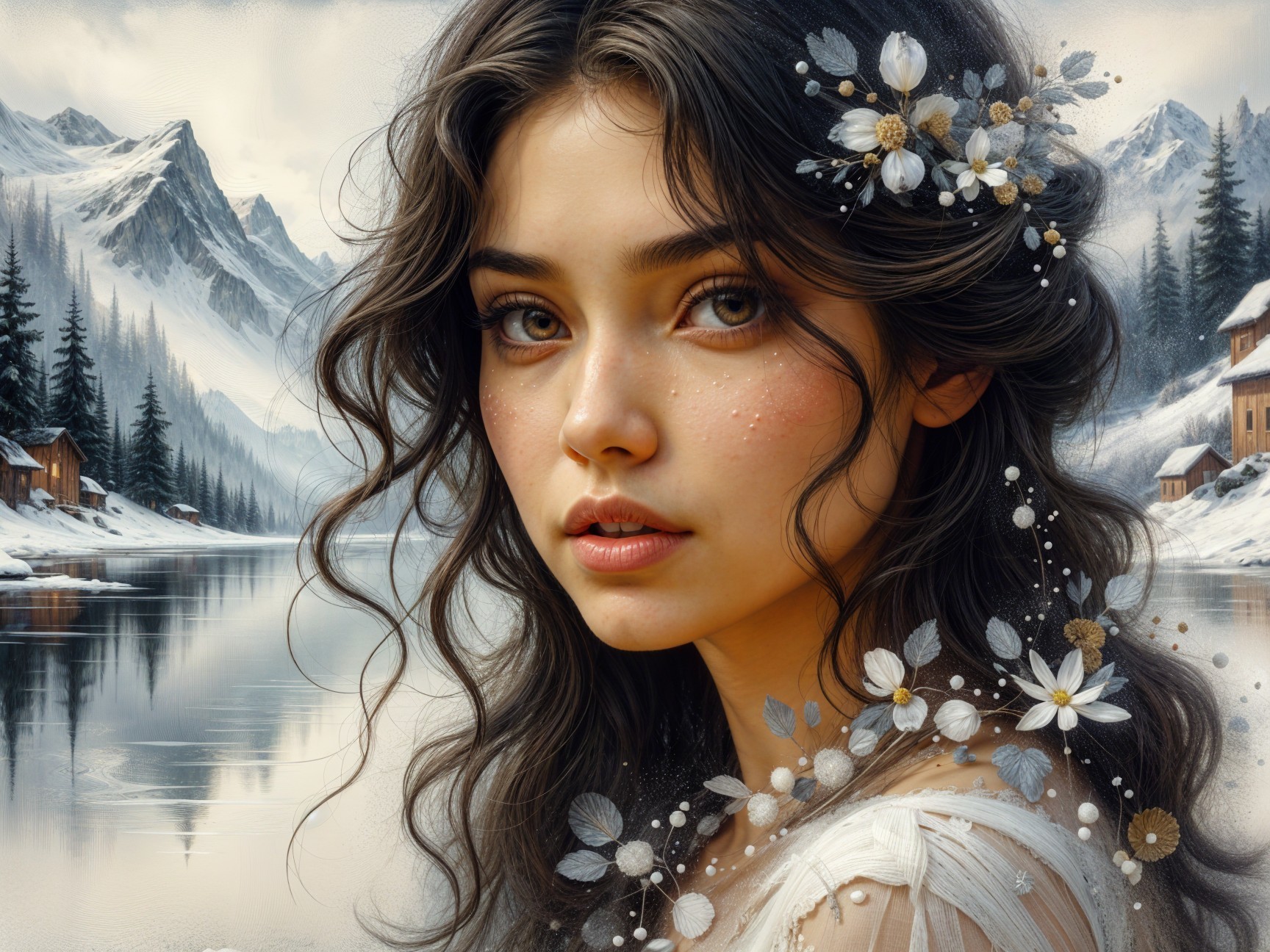 Prompt: a beautiful gothic woman, long black hair, wearing a headdress of intertwined frost-covered tree branches with black roses hanging down a vine. She is set against a backdrop of a softly falling snowstorm, with the subtle elegance of neo-impressionism influencing the brushwork and color palette. capture the essence with a wintry lens. Hauntingly beautiful