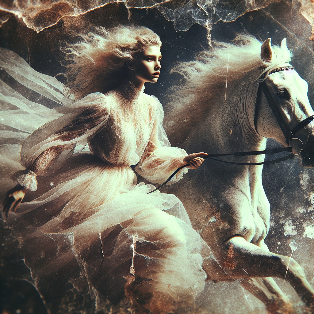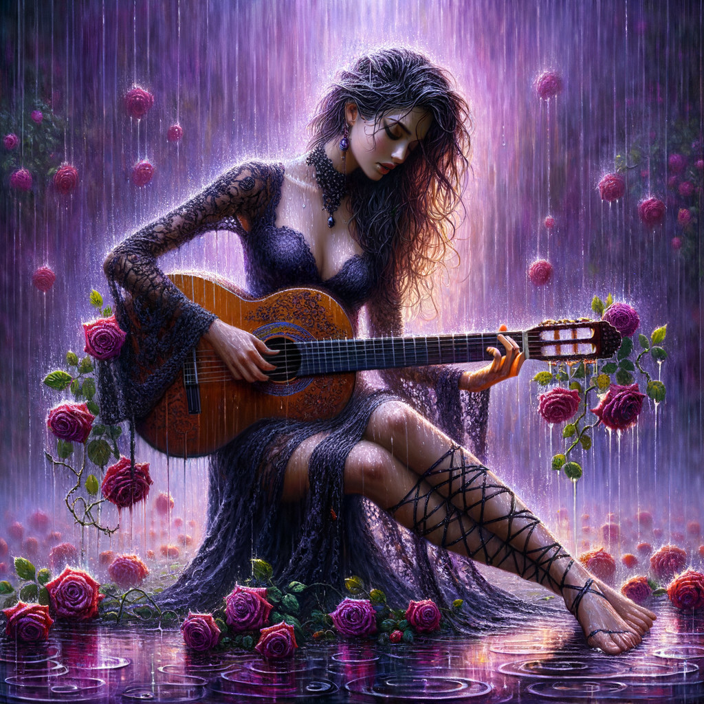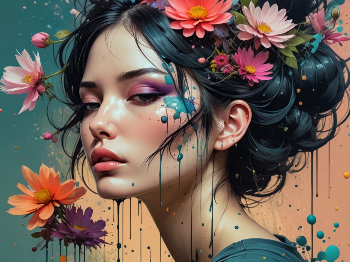 Prompt: a beautiful gothic woman, long black hair, wearing a headdress of intertwined frost-covered tree branches with black roses hanging down a vine. She is set against a backdrop of a softly falling snowstorm, with the subtle elegance of neo-impressionism influencing the brushwork and color palette. capture the essence with a wintry lens. Hauntingly beautiful