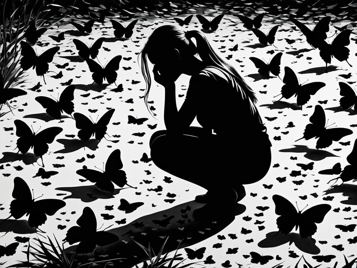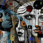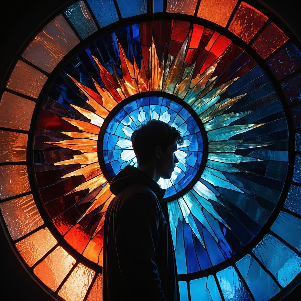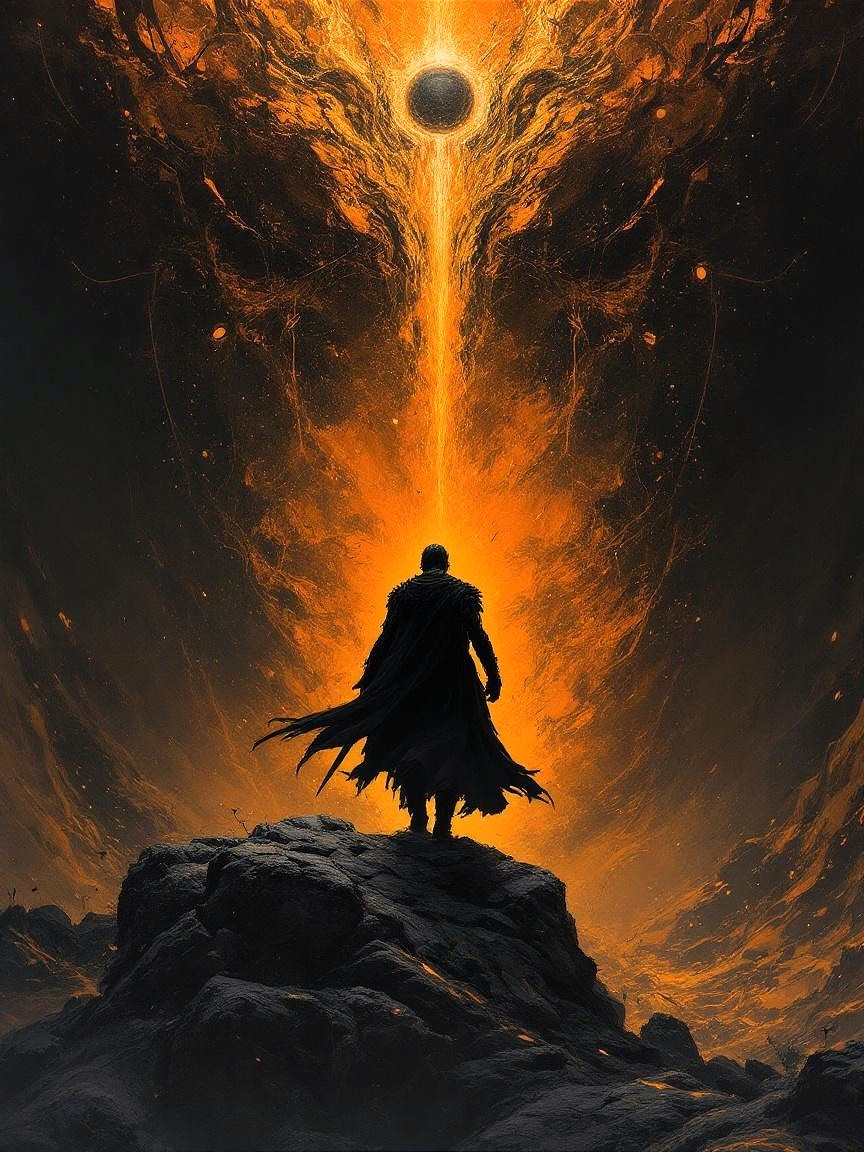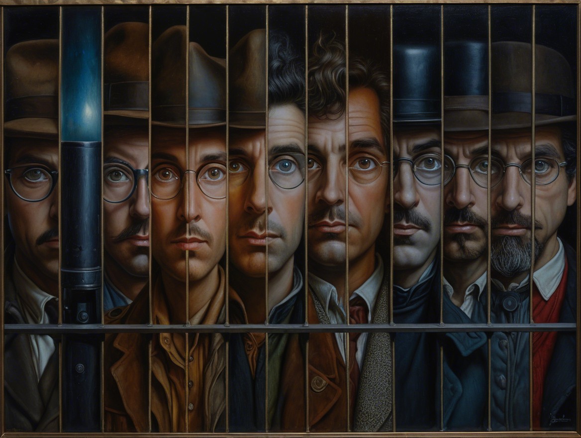 Prompt: A stark, surreal black and white portrait showcases a man with a dense mane of dark, tightly coiled curls, his gaze fixed intently on the viewer. The upper half of his face dramatically dissolves into a fractured mosaic of aged, cracked wall textures, creating a disquieting visual metaphor for inner turmoil. He is clad in a simple, dark turtleneck sweater, its smooth fabric contrasting sharply with the rough disintegration above, while soft directional lighting emphasizes the unsettling transition. The background is a seamless expanse of deep charcoal gray, intensifying the dramatic effect and focusing the viewer's attention entirely on the man's fragmented expression and the poignant phrase “Lost Reflections” subtly etched within the cracked wall.