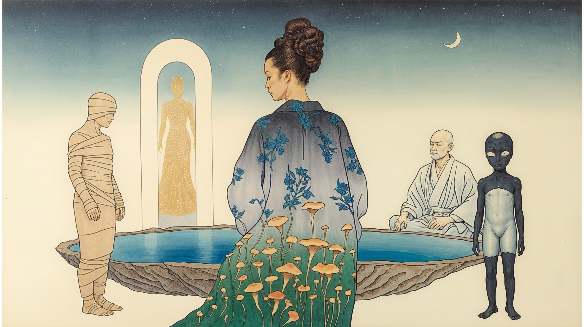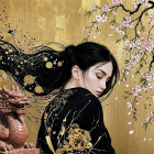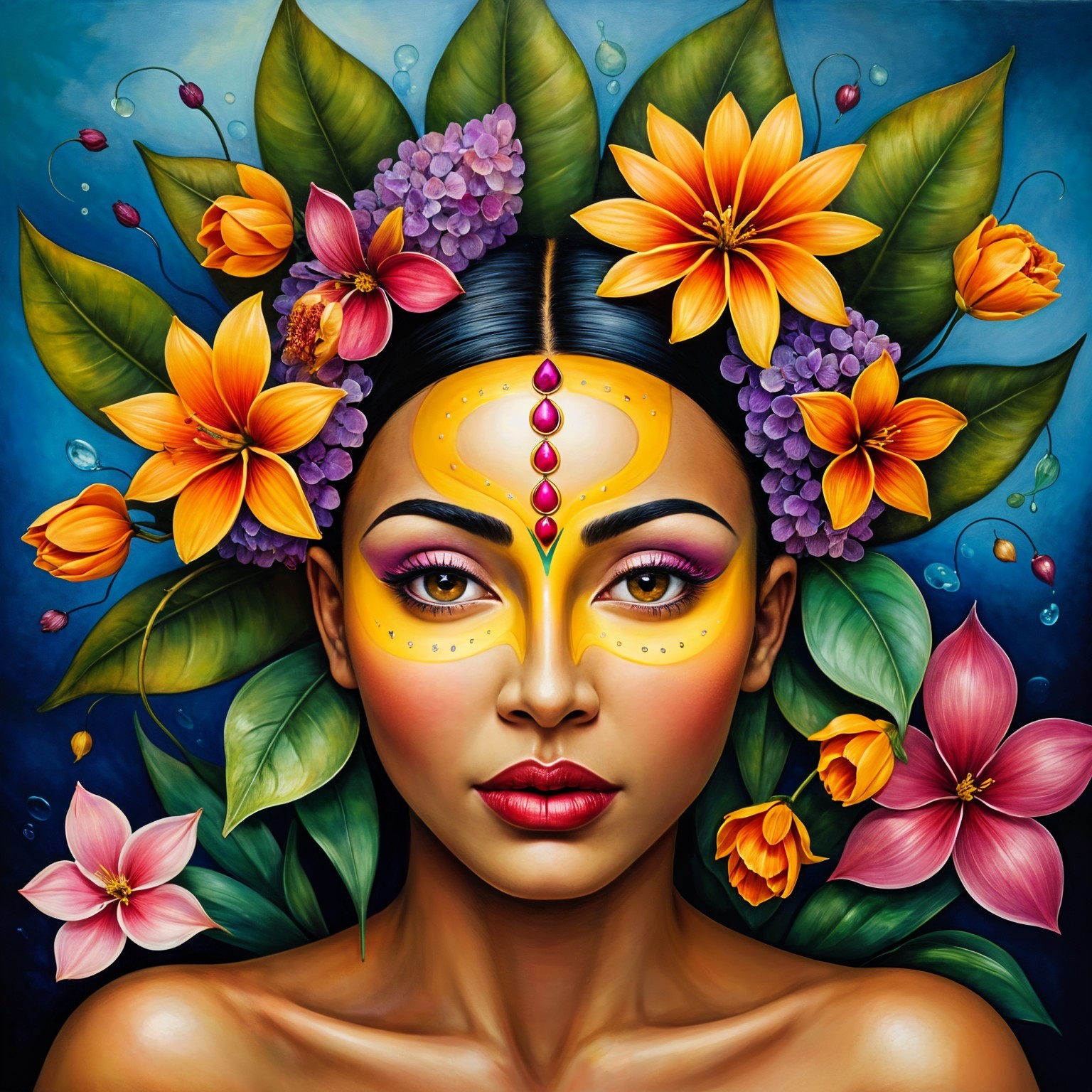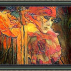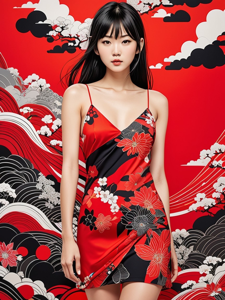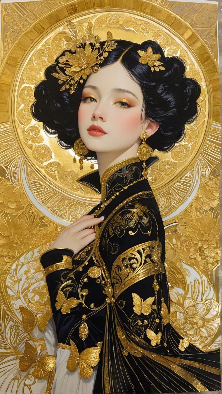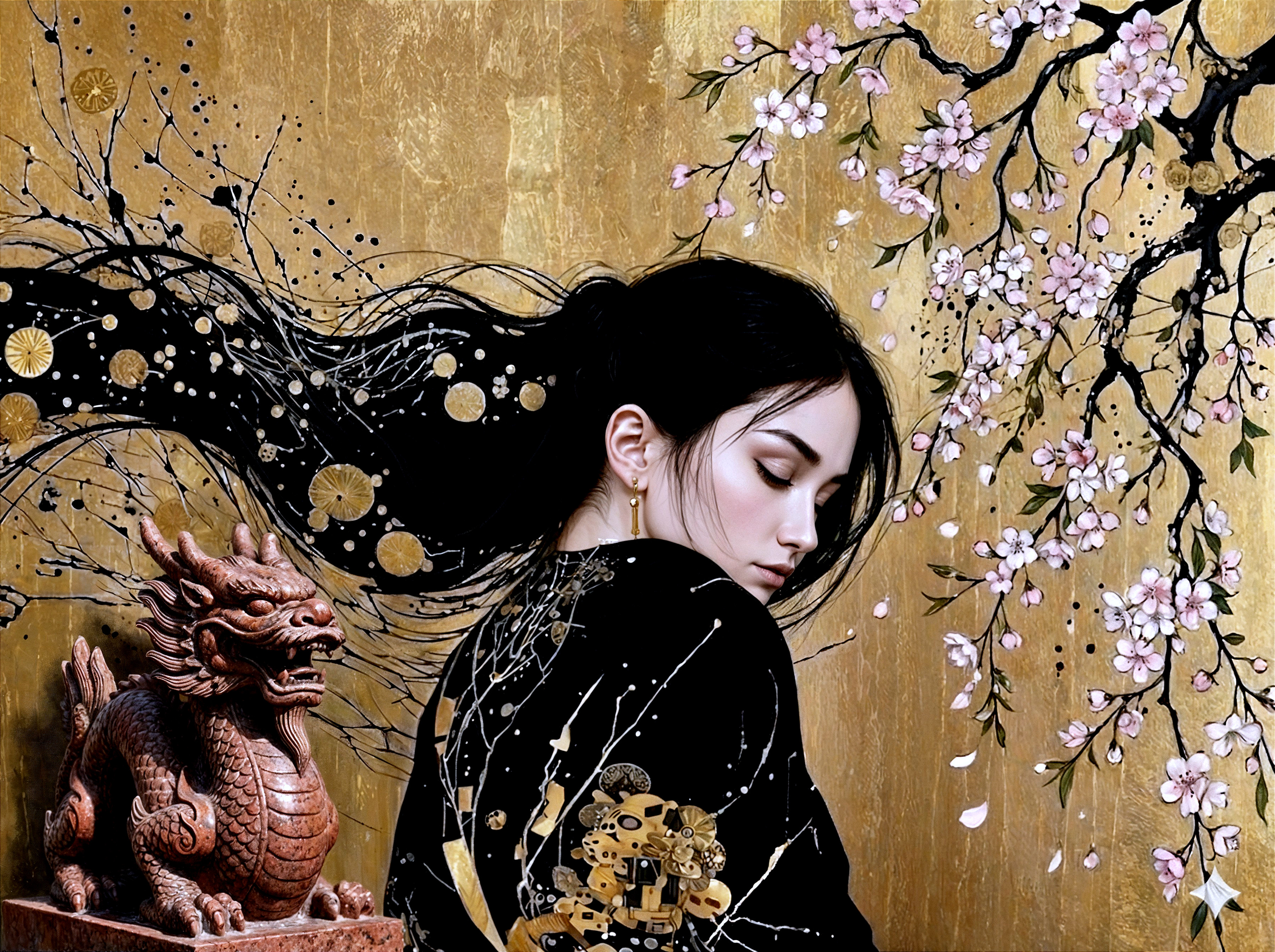 Prompt: Masterpiece, a multi-block color woodcut and linocut print in the style of an exquisite Japanese folio. A frontal close-up of a Japanese woman is rendered with profound detail and symbolic restraint. She wears an intricately patterned ceremonial silk kimono, its designs carved with meticulous, precise lines in a palette of rich, flat colors: deep crimson, golden yellow, vibrant magenta, and indigo blue. Her hands and underarms are hidden from view, each tucked into the opposite sleeve in the traditional, formal posture. The sleeves are bunched at the ends, their lowest edges deliberately cut off by the frame, implying they are wet with unseen tears a powerful symbolic absence. Her face is stone-still, carved with minimal, serene lines that convey profound, contained emotion. Behind her stands a row of young ginkgo saplings in autumn, their fan-shaped leaves rendered as a uniform tapestry of solid, bright yellow, creating a stark, beautiful contrast against the complexity of her kimono. The composition is one of masterful clarity and emotional depth. The high-contrast between the vibrant kimono and the bright yellow leaves emphasizes her stillness and inner sorrow. The print is a study in restraint and symbolism, where what is hidden speaks louder than what is shown. Ukiyo-e, woodcut, linocut, key block, bold outlines, flat colors, symbolic, atmospheric, high-contrast, textured, stylistic, masterful.