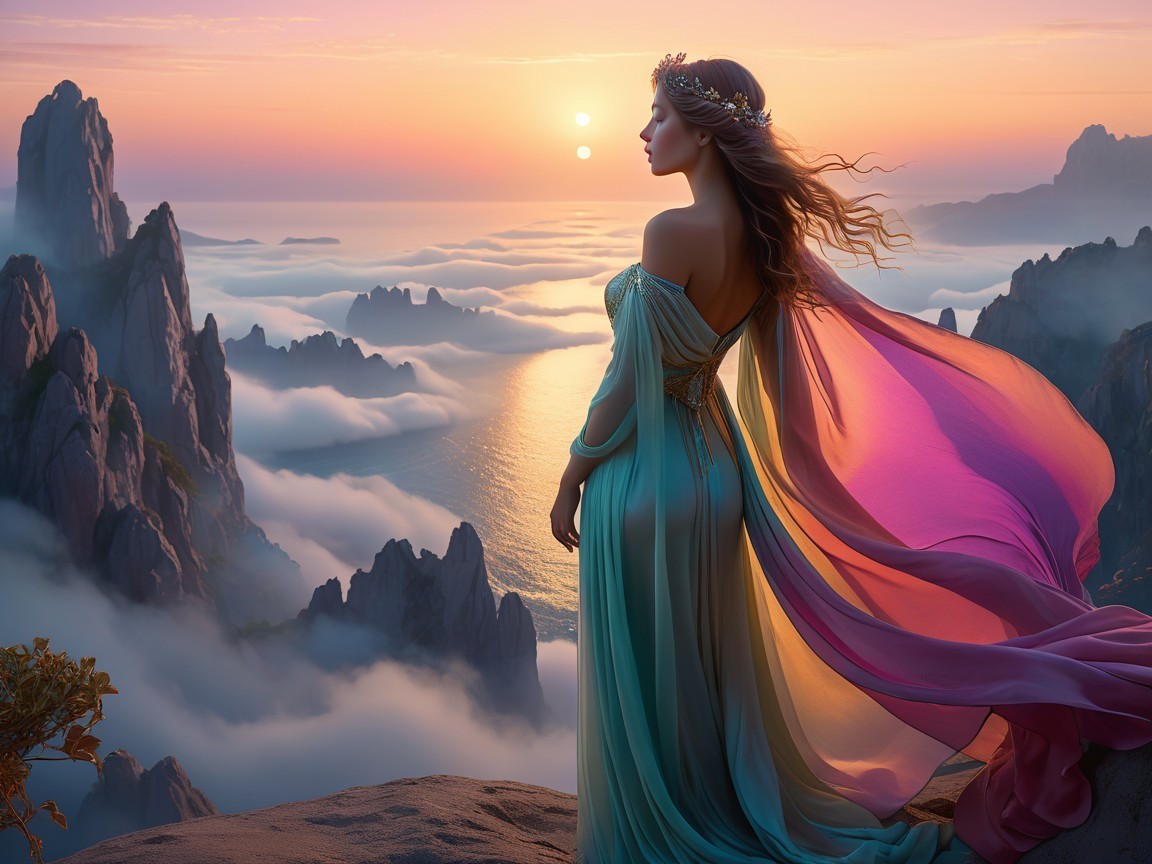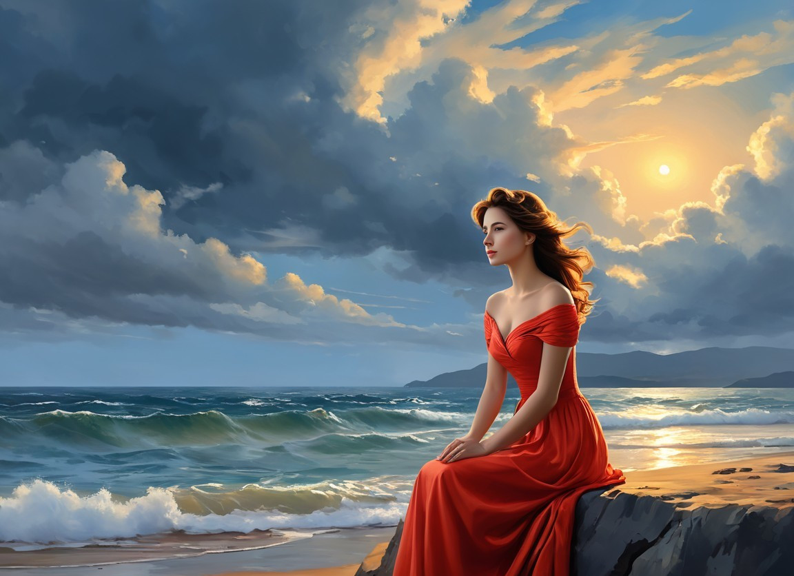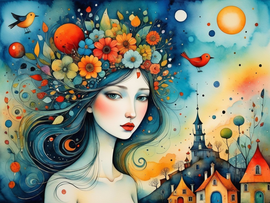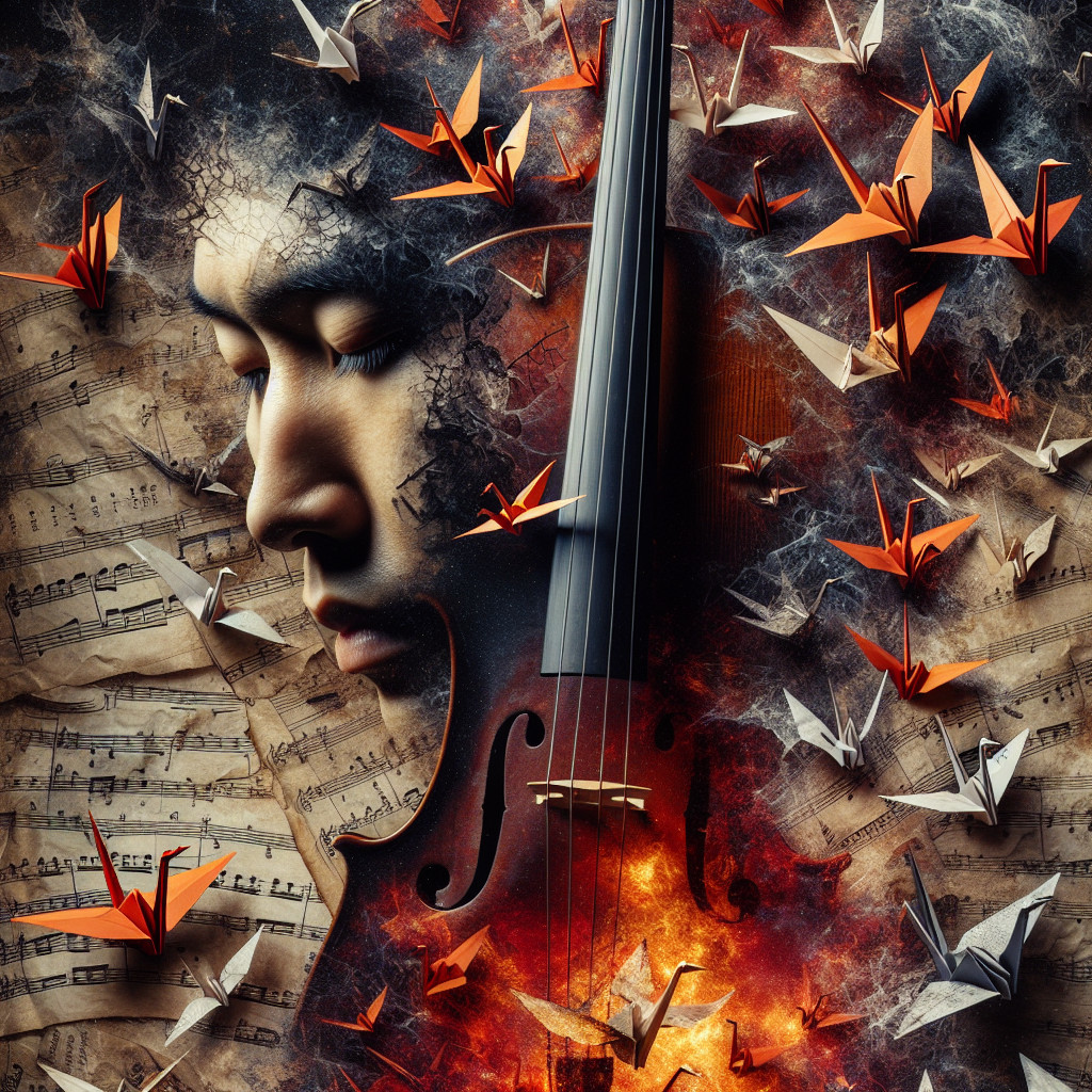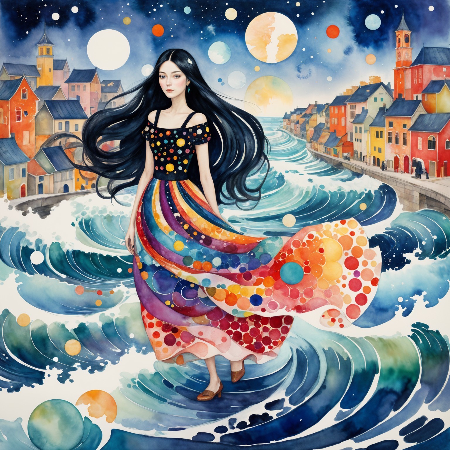 Prompt: Masterpiece, a multi-block color woodcut and linocut print in the style of an exquisite Japanese folio. A frontal close-up of a Japanese woman is rendered with profound detail and symbolic restraint. She wears an intricately patterned ceremonial silk kimono, its designs carved with meticulous, precise lines in a palette of rich, flat colors: deep crimson, golden yellow, vibrant magenta, and indigo blue. Her hands and underarms are hidden from view, each tucked into the opposite sleeve in the traditional, formal posture. The sleeves are bunched at the ends, their lowest edges deliberately cut off by the frame, implying they are wet with unseen tears a powerful symbolic absence. Her face is stone-still, carved with minimal, serene lines that convey profound, contained emotion. Behind her stands a row of young ginkgo saplings in autumn, their fan-shaped leaves rendered as a uniform tapestry of solid, bright yellow, creating a stark, beautiful contrast against the complexity of her kimono. The composition is one of masterful clarity and emotional depth. The high-contrast between the vibrant kimono and the bright yellow leaves emphasizes her stillness and inner sorrow. The print is a study in restraint and symbolism, where what is hidden speaks louder than what is shown. Ukiyo-e, woodcut, linocut, key block, bold outlines, flat colors, symbolic, atmospheric, high-contrast, textured, stylistic, masterful.
