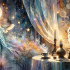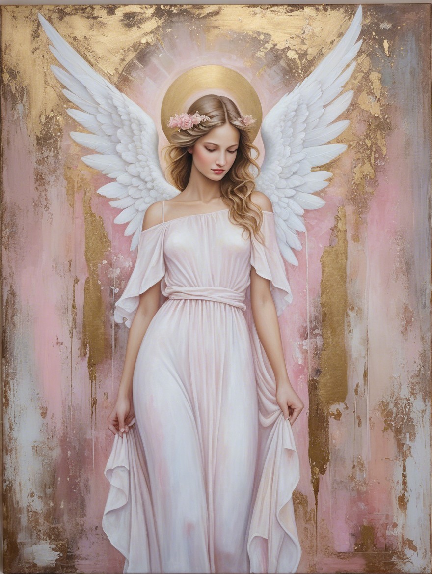Prompt: A whimsical, enchanting watercolor illustration in soft, dreamlike colors. The central focus is a sleeping angelic child with curly blonde hair and a white nightgown, lying peacefully on a fluffy white cloud in a deep blue, starry night sky. The child has white feathered wings and a faint halo. Small, delicate fairies with translucent wings are floating around the central cloud. A smiling crescent moon is visible in the upper left corner. The scene is framed by stylized, large blue and gold floral elements and greenery at the bottom. The style should be reminiscent of classic children's book illustrations, with a gentle, glowing atmosphere and detailed stars.
