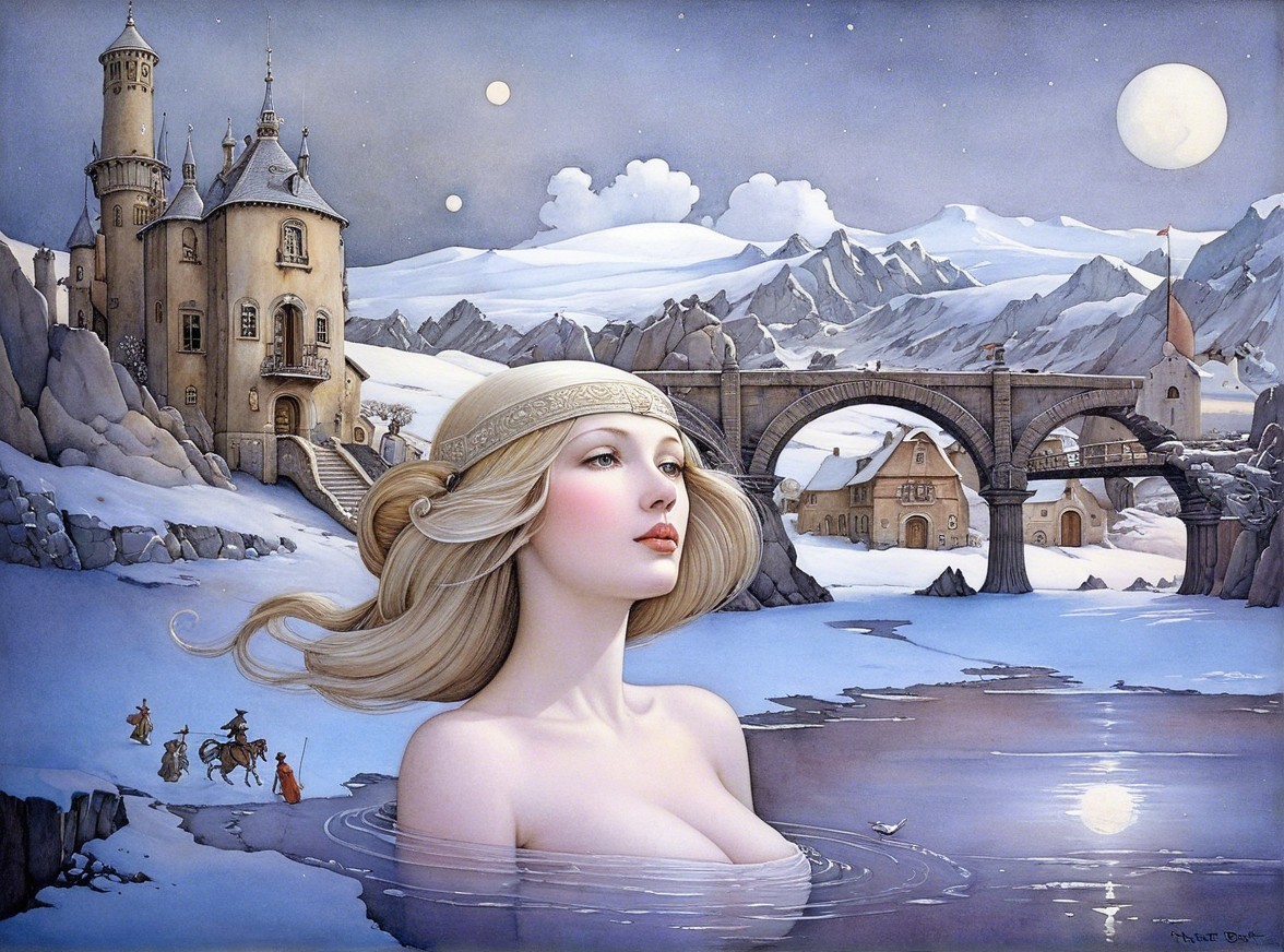 Prompt: Water Never forgets. Some of her memories are frozen, while other memories are fluid and always flowing. Beautiful sacred geometry underlies the composition of this image. Features a full pallet of pastel colors.