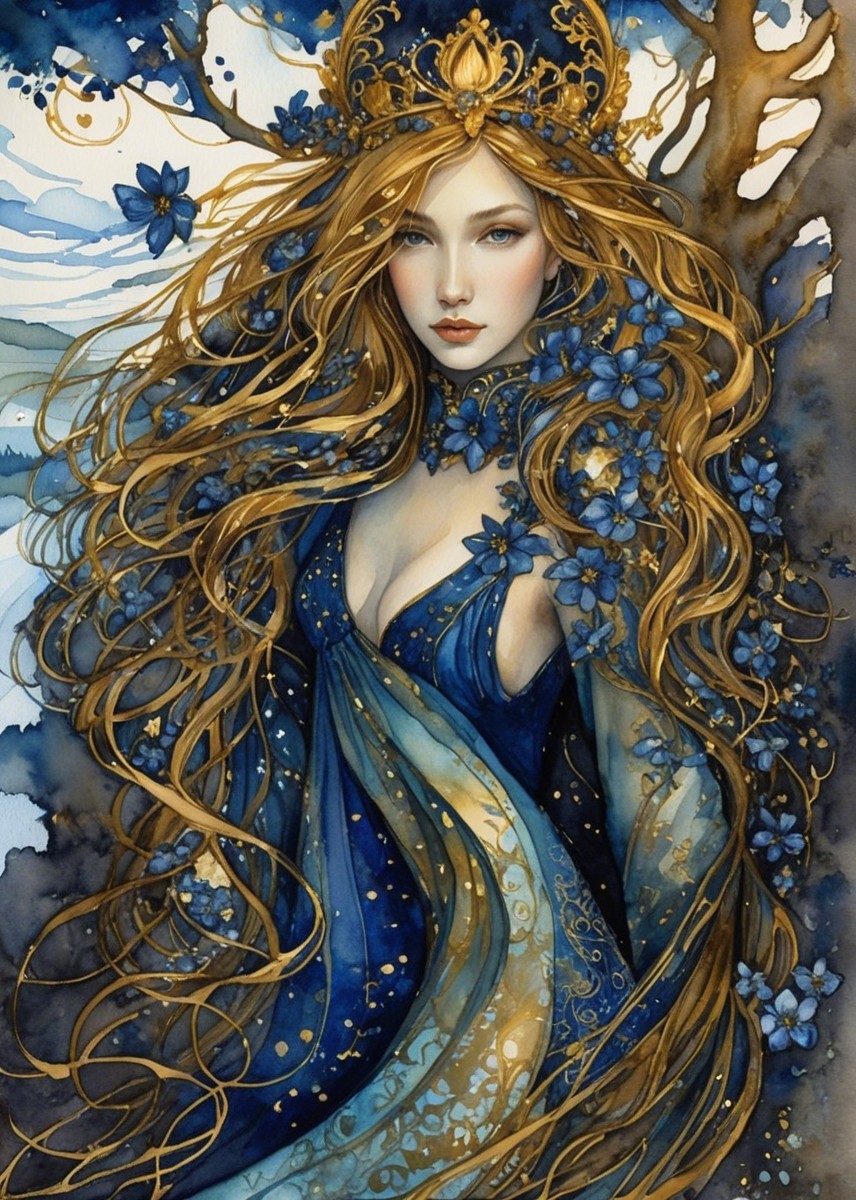 Prompt: I have a vision… Harmony in motion. Escape perspective. The background is dark blue, figure in an outdoor fantasy land, sketched in ink on it. Tight development. Dark blue flowers. Tight development. Nuances in gold. Watercolors and alcohol inks in the style of Ingebjorg Froydis Stoyva. Golden nuances. The softly lit background adds an ethereal glow, enhancing the overall beauty and artistic style of the piece, which is glazed, shiny and polished