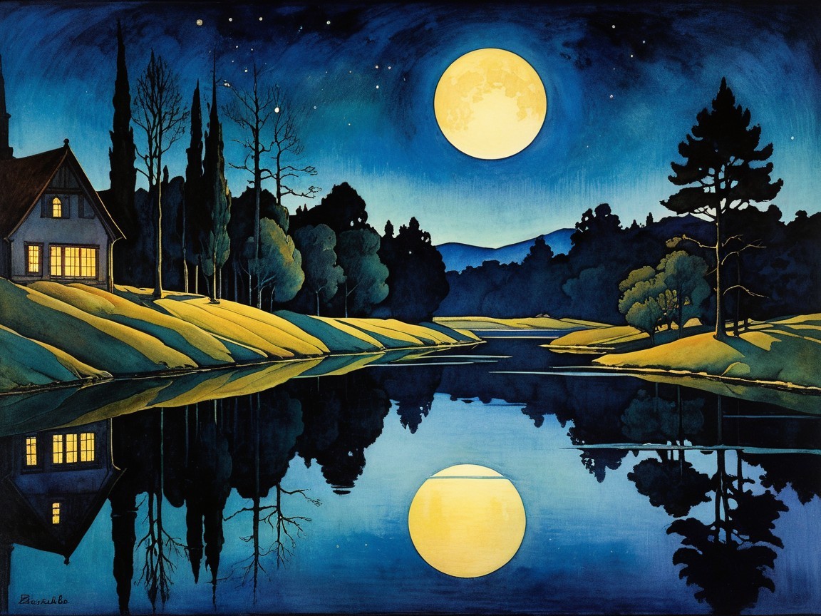 Prompt: Surreal beauty. A thing of beauty is a joy forever, night Scene Beauty in the style of Ernest Bieler