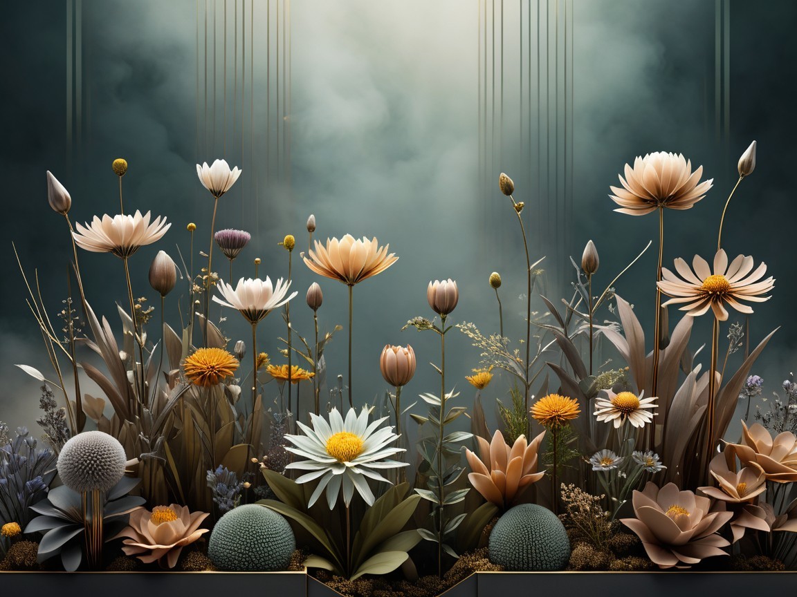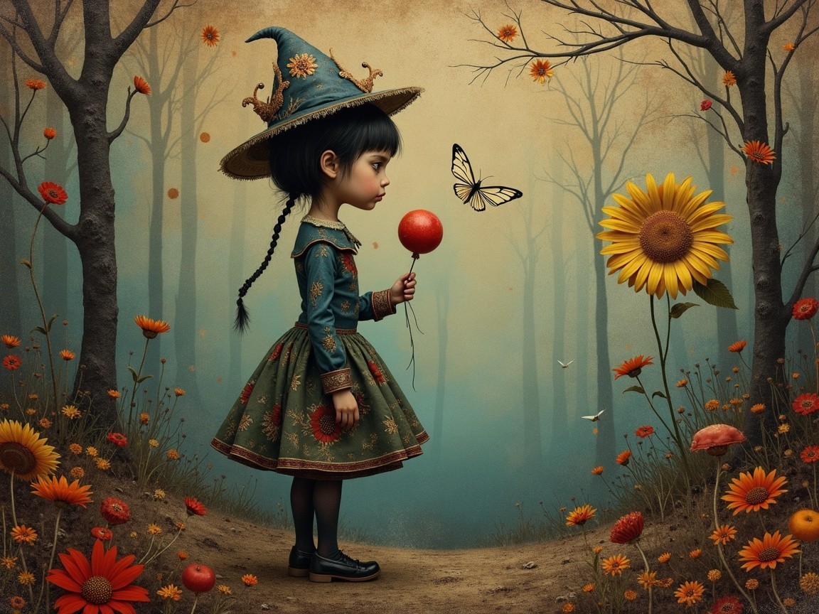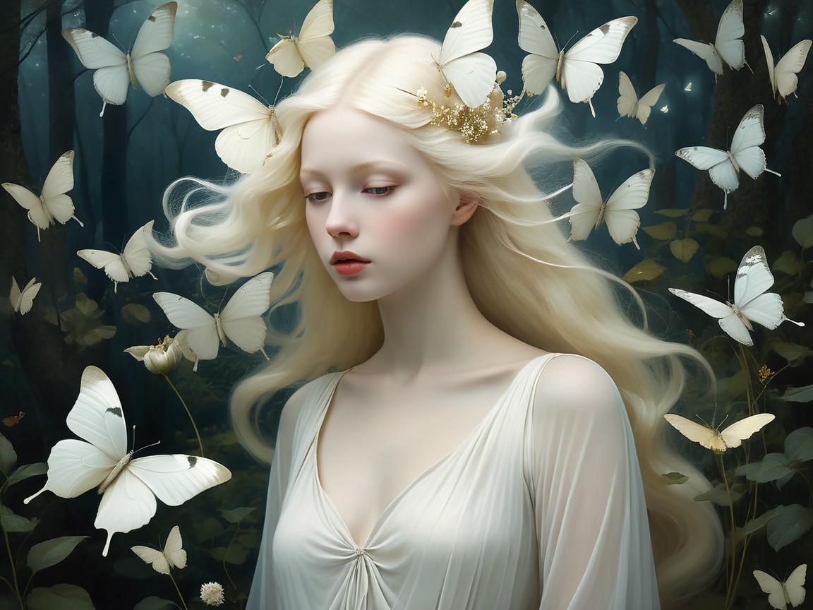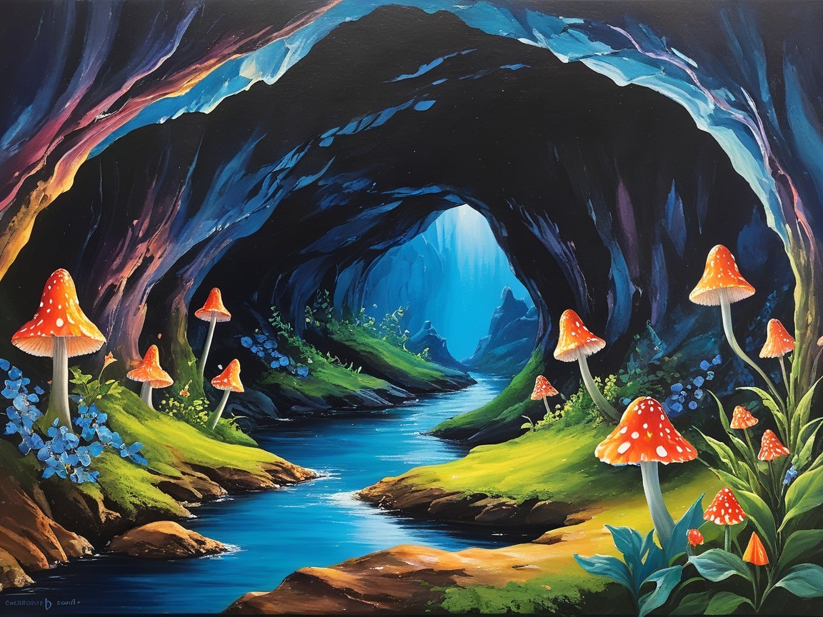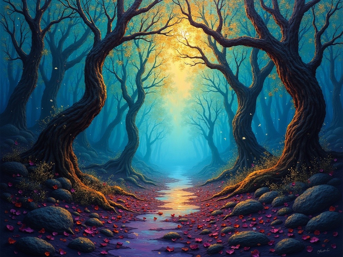 Prompt: Ancient woodland setting, streaming sunbeams filtering through dense canopy, intricate fungus growth on aged trees, vibrant mushrooms scattered on the forest floor, ethereal bioluminescent flowers glowing softly, tranquil water reflecting the lush surroundings, delicate vines weaving through the undergrowth, a serene small pond mirroring the sky above, watercolor strokes capturing the essence of nature, elegant and detailed masterpiece with dynamic lighting, award-winning quality with hyperrealistic elements, crisp and colorful imagery, cinematic post-processing enhancing the atmosphere, inspired by Arthur Rackham, Steve Hanks, Marc Simonetti, and Craig Mullins, composition following the golden ratio for a visually pleasing arrangement.