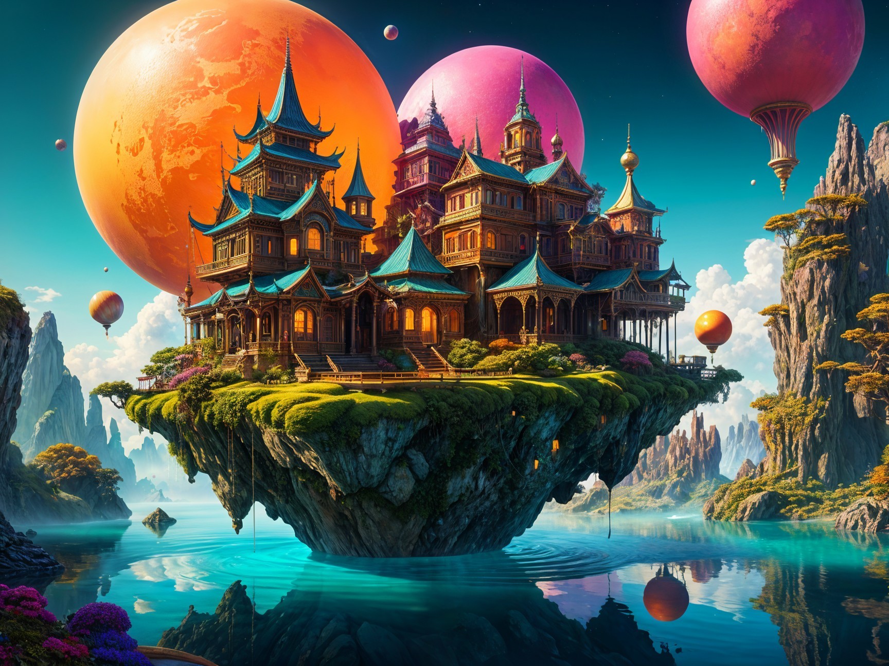Prompt: A beautifully crafted tea set featuring a teapot designed as an ornate Chinese junk boat, complete with intricately shaped sails and miniature pagodas. The teapot is adorned with blue and white patterns representing waves and floral motifs. Surrounding the teapot are four elegant teacups, each with matching blue and white designs and golden rims. The scene is illuminated by warm, golden light, creating a tranquil atmosphere, with delicate petals floating in the air.