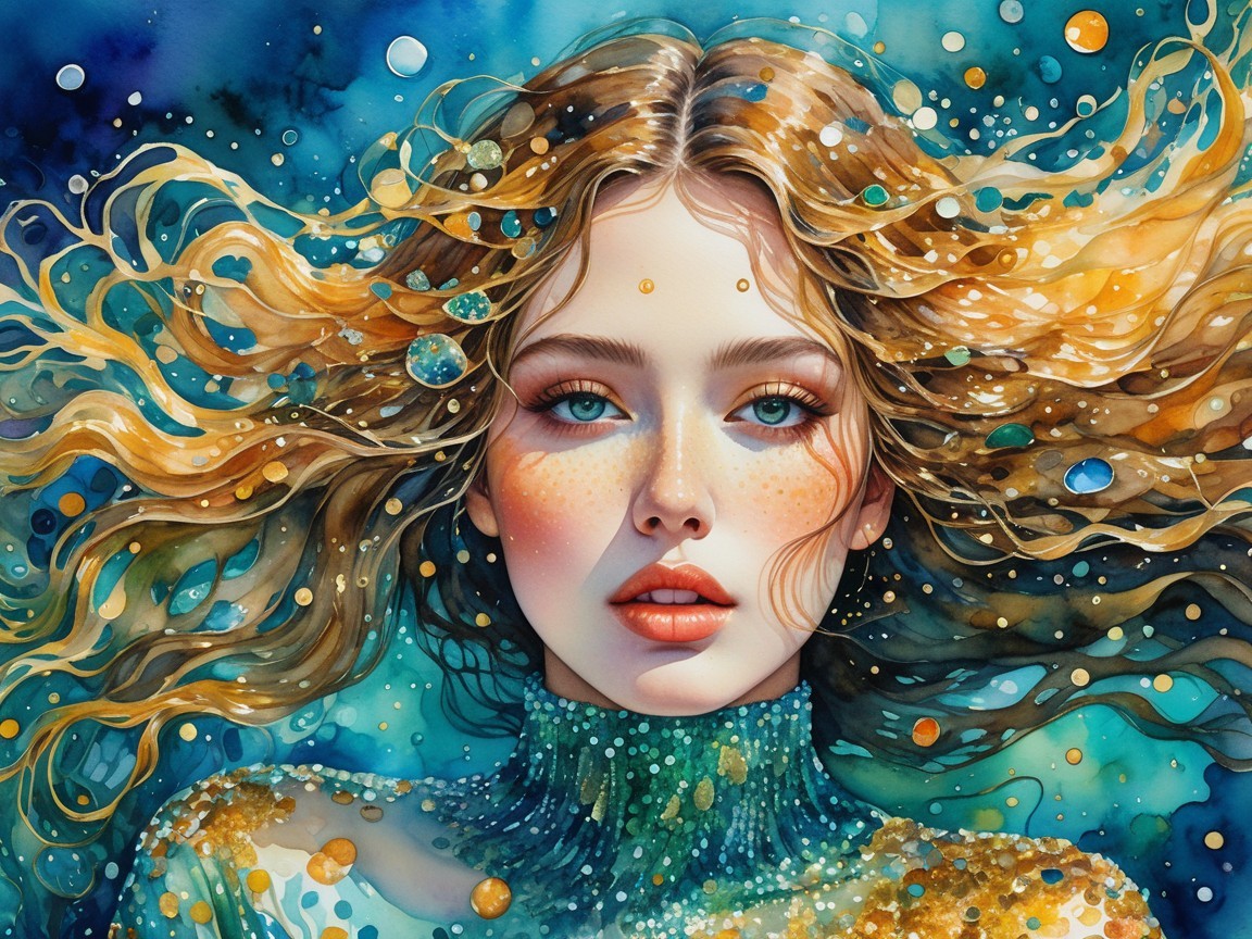 Prompt: Golden ratio, ultra detailed watercolor painting, wet on wet painting, soft edges beautiful (((Masterpiece))) Create an image of a calico cat partially submerged in water, with its face and upper neck visible just above the surface. The cat has distinct patches of orange, black, and white fur, giving it a vibrant and colorful appearance. Its eyes are large and expressive, with a bright green hue that reflects the light filtering through the water. The background is a rich underwater scene, with lush aquatic plants and rocks in various shades that add texture and depth. To the right of the cat, a small goldfish swims gracefully, enhancing the aquatic theme. The surface of the water is slightly rippled, reflecting the green hues of the underwater vegetation. The overall composition should convey a sense of curiosity and wonder, capturing the serene beauty of this underwater Encounter. No frame no artifacts no words.