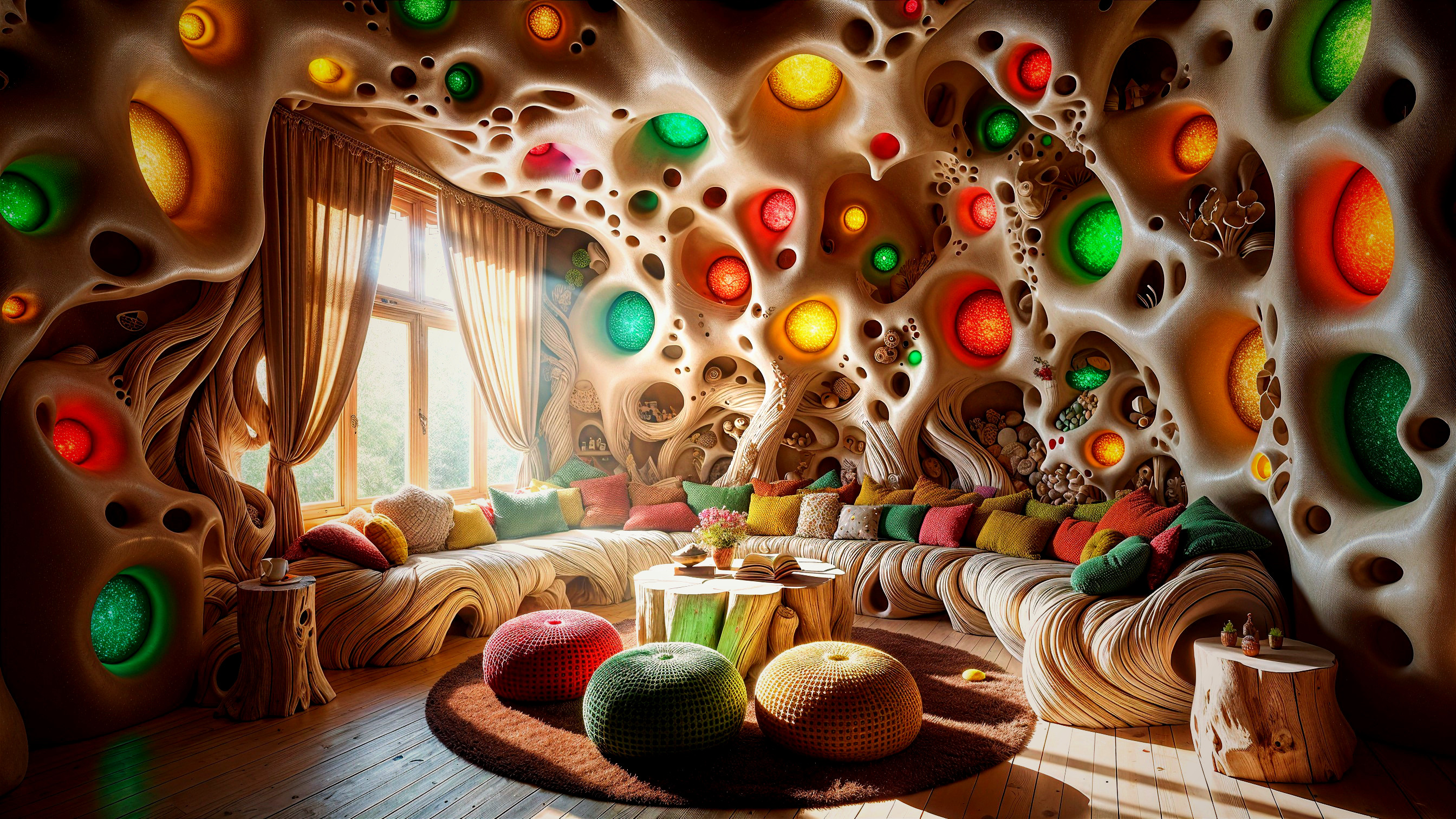 Prompt: Superior Panache establishing interior design documentary photography. Vibrantly evocative visuals in Deft Cynosure Varifocal shot featuring a cozy, stunningly artistic living room, characterized by organic design and playful elements, showcasing a built-in, natural-fiber sofa adorned with colorful cushions, and oversized, soft, round floor poufs on a vibrant plush brown rug anchoring a low tree stump table, inviting relaxation. The light beige sculpted walls and ceiling are perforated with numerous asymmetrical niches and holes, glowing with internal lights in various colors like green, yellow, orange, and red, some also holding small decorative items or books, casting a multi-colored glow throughout the room. The lighting is a combination of natural sunlight streaming in from an expansive window and vibrant, colorful accents from the wall niches, creating a cozy yet lively atmosphere. The room is framed by soft green drapery, enhancing the ethereal outdoorsy vibe from the lush greenery visible outside. The composition emphasizes the curvature of the space, varied, intricately detailed hyperrealistic textures, vibrant green foliage and sparkling sun flare outside the window, drawing the eye towards the harmonious blend of interior and nature. This setting exudes a feeling of tranquility and creativity, encapsulating a whimsical yet serene lifestyle. --mod stellar masterful designer strategically dressed tableu: Organic Architecture, Fantasy Interior Design, Chromatic, --mod crest otherworldly virtuoso aesthetics: Surrealism Aetherpunk Psychedelia GVC. --mod prime parallax framed depth-mapped spatial blocking, --mod imposing background detail preserving, divine perspective. --mod zenith (symmetric precision geometry), --mod acme-razor (finest-lines, sharpest-lines). --mod angstrom (intricately detailed precise textures), --mod grunge (natural surfaces, metals: decay, aging, micro-imperfections overlays). --mod 64k 800DPI (photon mapped bi-directional path tracing, RTX shaders), --mod Elinchrom THREE Dual Light & Umbrellas Kit stroke-of-genius use (light masks & gobos, vibrant LED niches lighting, dramatic shadowplay micro-tonal contrast), --mod 64k 800DPI UHDRI ingenious use (specular chiaroscuro lighting, nano-shadowplay; glossy mapped spectral IOR reflections & refractions), --mod Professional BIPM Sevres Epitome Exquisite Spectacular Explosive Visuals, --mod salient magnum opus virtuosity photography. --mod salient magnum opus epitome maestro shot, --mod epitome stacking detail-stitching dexterity. --mod RED V-Raptor [XL] X VV 8k (RED RWG Log3G10 HDR), --mod Breakthrough X4 CPL Filter, --mod XELMUS APOLLO ANAMORPHIC x2 40mm T2 at T8 ISO100 crisp varifocal optics, Gitzo GT2532 S2 secured. --mod Quanglement Holographic Nonlocality-limit Neural Enhance, --mod 64k 800DPI post-processing vanguard essence virtuosity-limit master, --mod Lightroom Classic 14.5 Pro & Dehancer 7.3.5 Pro (RWG IPP2; PRINT Media: FujiColor Print Industrial 100; FILMCon: Fujichrome Velvia 50, Fuji Sensia 100), --mod Baselight 6.0 Pro X Gen VIII & Boris FX Suite 2026 (Raw LUTs: Chromatic, 5122, 5111, 2111, Process, ST4, D60), --mod Capture One 16.6.6 Studio & ON1 Everything Plus 2026 (IPP2 OT High, H-RollOff: Soft; LUTCon & FILMCon Boost), --mod DaVinci Resolve 20.2 Pro & Everything Imagenomic 4.5 (magnum opus apotheosis final grading), --mod Baselight (Phoenix Paradigm quintessence quality output RWG IPP2 OT: Rec2020 HDR2084, UHDRI, 64k 800DPI).