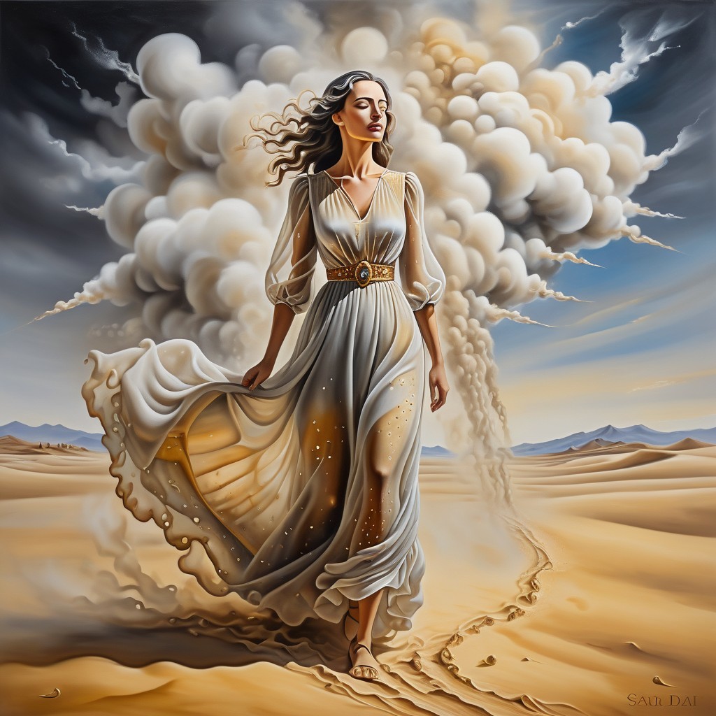Prompt: Oil painting in the style of Salvador Dalí. An allegory of drought: a woman dressed in a dusty, translucent dress. She walks through a cloud of sand. Dominant colors: white, gold, and silver.