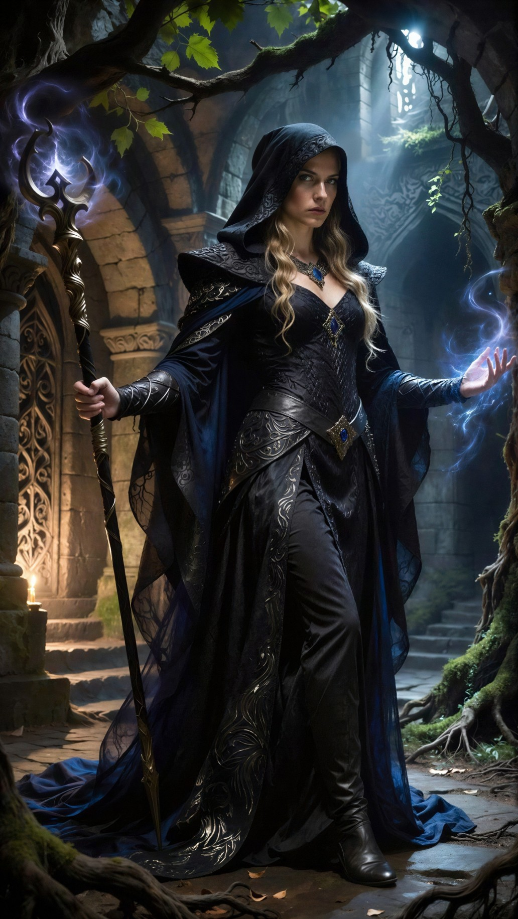 Prompt: A majestic eagle with dark blue feathers perches on a gnarled tree branch. The branch is adorned with golden leaves. The background is a mystical blue starry night sky filled with shimmering golden dust and twinkling stars and an crescent moon. The overall scene is fantastical and magical, with a focus on glowing light effects and intricate details on the eagle's feathers and the tree bark. The lighting is ethereal, casting a warm glow on the eagle against the dark background. Intricate details, high fantasy, photorealistic, volumetric lighting.
