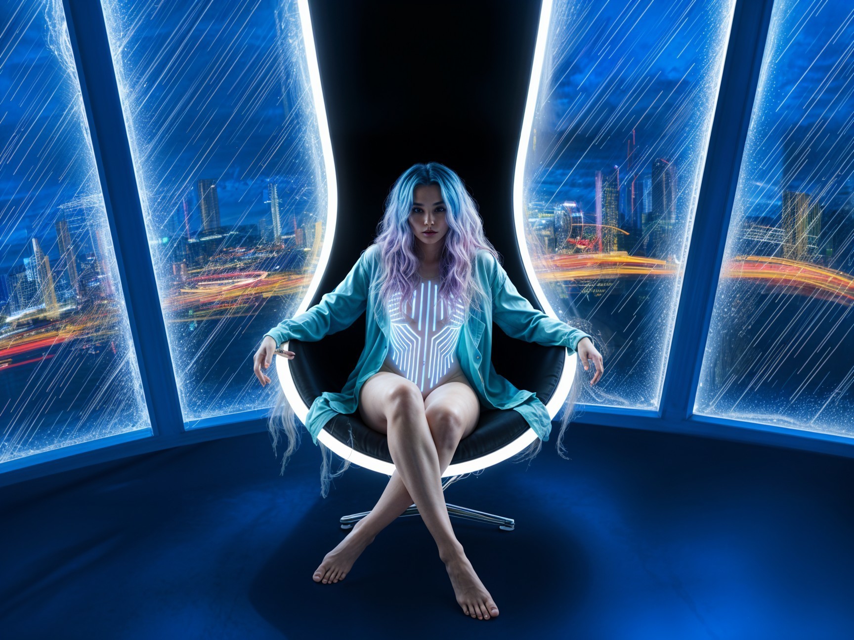 Prompt: semi-abstract oil painting of a beautiful young woman with long blonde hair and pale face, shown at half-length, standing looking towards us, wearing white clothes, in a dark room with many lines of geometric neon blue light bulbs and a few pink bulbs on the wall behind her, creating a blue-violet glow on her, in the style of Harald Sohlberg, Vilhelm Hammershøi, Pierre Bonnard, Henri Matisse, Gustav Klimt, Henri de Toulouse-Lautrec