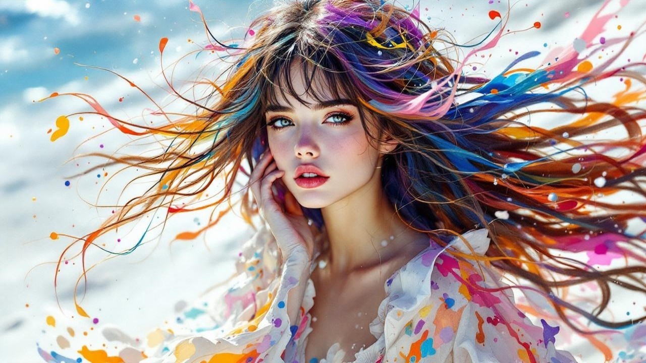 Prompt: A multi media image of an young Waterhouse woman in a flowing dress. She is kicking up one side of the dress and her head is thrown back as she tips backwards. Her long curly hair swirls like her dress. There are splashes and patterns and collaged images and spatters of paint all over. Wet on wet watercolour and ink. Red and black and blue and complementary colours. Ordered and beautiful chaos.