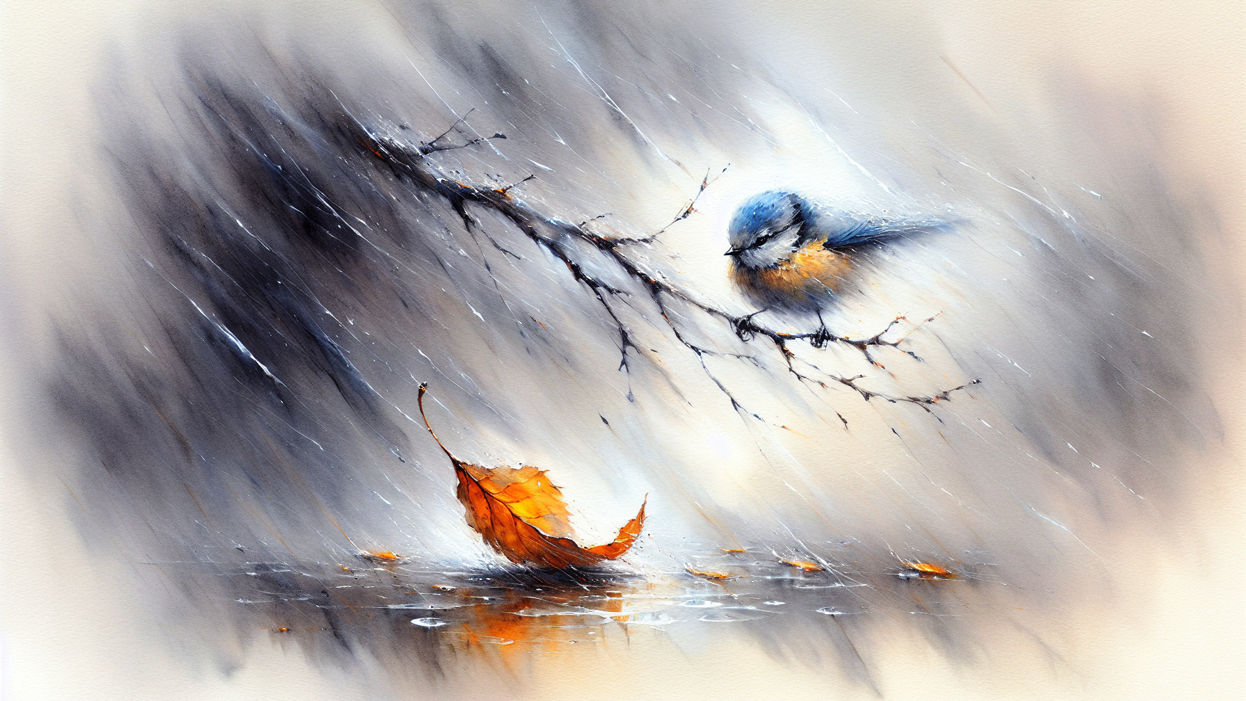 Prompt: Paint a dreamy hazy breezy wet on wet watercolour artwork, using minimal paints and maximum loose water effects, EmmAI autumnal colour palette, melancholy composition, minimalist, impressionist, with no text, no artifacts. A tranquil winter scene with a serene lake in the foreground, surrounded by a snowy landscape. In the background, a dense forest of evergreen trees, some dusted with snow, stands against a pale sky. Delicate, bare branches extend from the sides of the image, adorned with a few bright orange leaves, adding a splash of color to the predominantly white and grey palette. The subtle melancholy mood is peaceful and reminiscent of a quiet winter day.