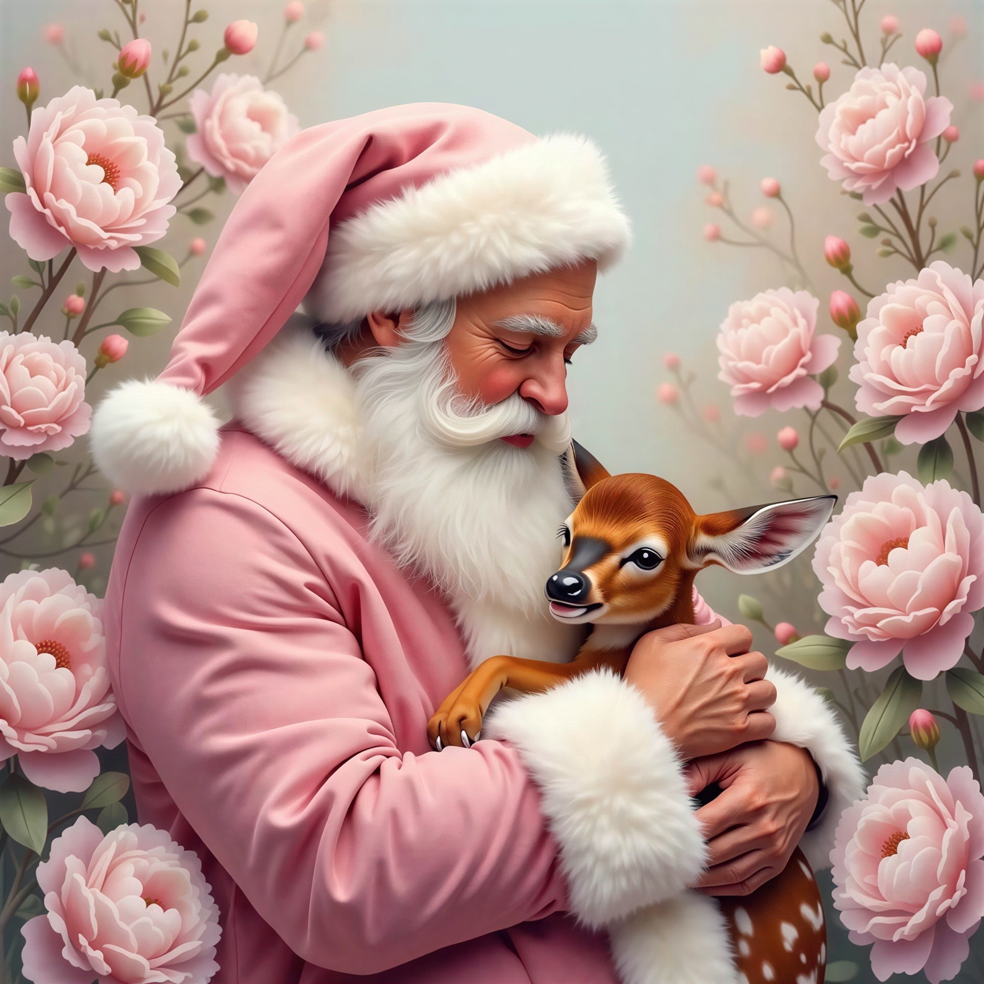 Prompt: A tender, highly detailed oil painting of Santa Claus gently embracing a young fawn. Santa is wearing a soft, velvety rose-pink suit and his classic fur-trimmed hat, his eyes are closed in a serene expression. The fawn is nestled against him, also with its eyes closed. The subjects are surrounded by an abundance of large, pale pink and white peonies and roses, creating a lush, ethereal, and romantic atmosphere. The style should blend photorealism with painterly brushstrokes, with a focus on a soft, pastel color palette and a dreamy, watercolor-like background wash.