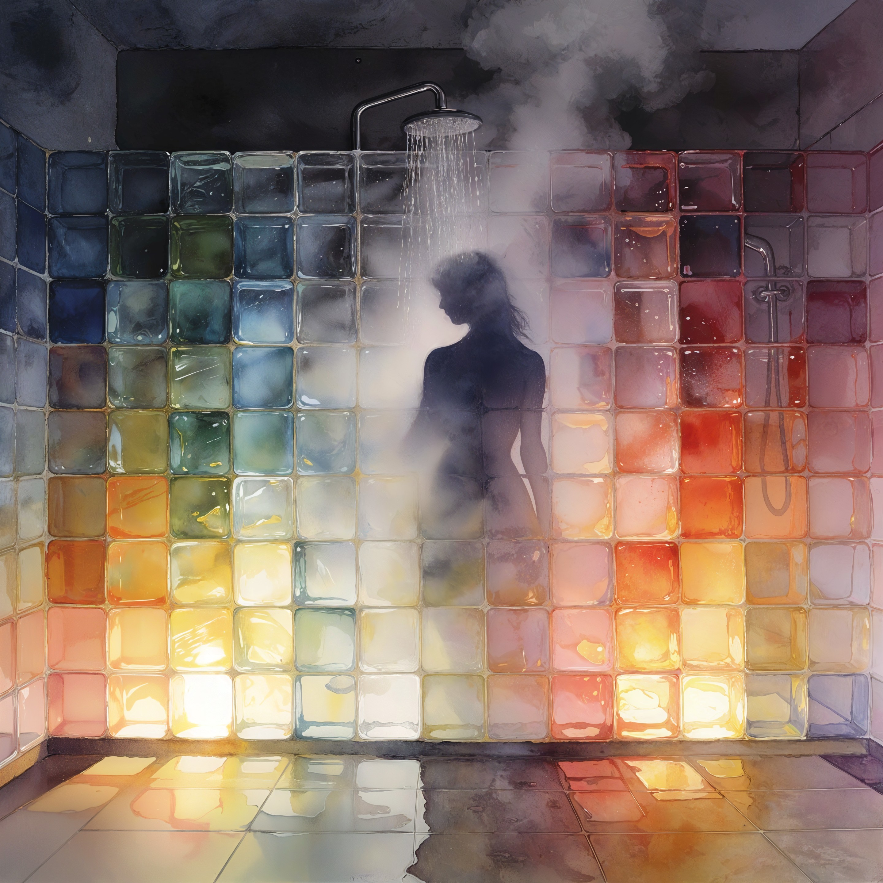 Prompt: Moody watercolor bathroom, travel-sketch style. A solid, floor-to-ceiling wall of vibrant, multicolored translucent glass tiles in the foreground, glowing with soft, internal light. Behind this dense wall of glowing tiles and obscuring steam, the abstract, completely blurred silhouette of a woman showering is visible only as a poetic, deep shadow, with no discernible features, completely covered by the tile wall effect. Dreamy, poetic atmosphere, gentle washes.
