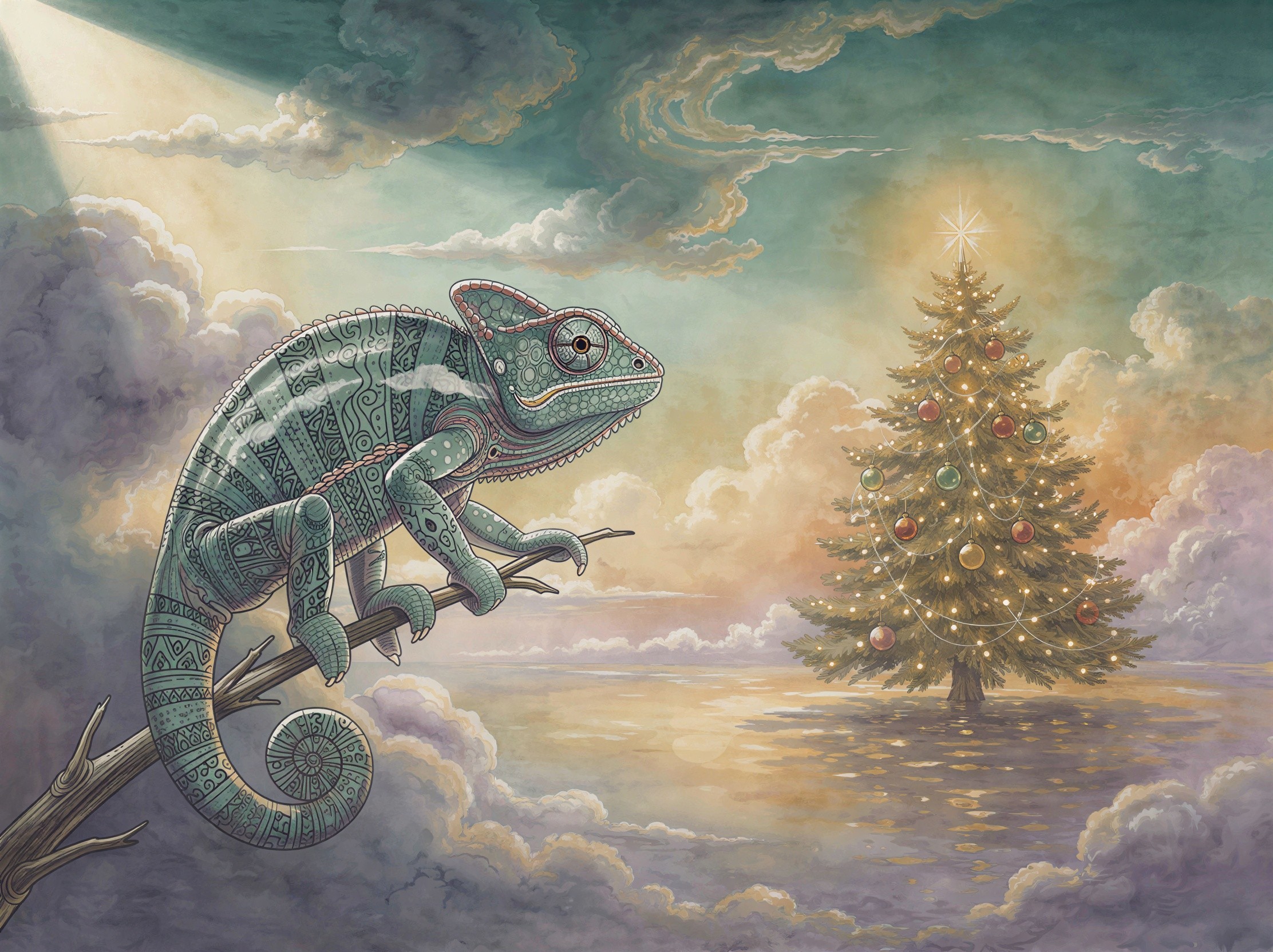 Prompt: A lively detailed chalk and crayon sketch showing Christmas cat carnage: shredded packages, broken ornaments, toppled Christmas tree with bits of balsam fir fronds sticking to the cat's coat, blending the styles of Ralph Steadman, Quentin Blake, and George Booth's manic animals; warm and colorful magical realism by Gerhard Glück and Michael Sowa