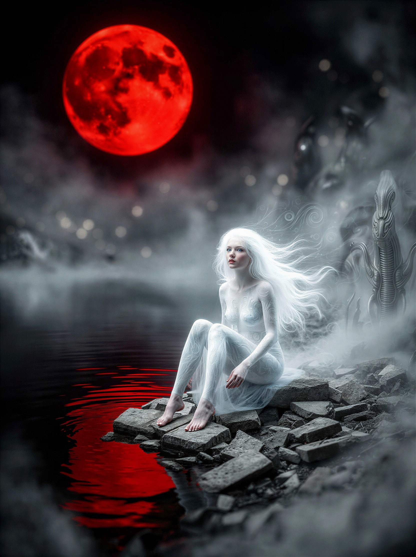 Prompt: Pale translucent ghost of a white-haired beauty, barefoot, sitting by a lake on crumbled stones under a full red moon at midnight, enveloped in dense fog and mist. Shallow depth of field creating a dreamlike, ominous atmosphere with high contrast and modern art style. Cinematic, high detailed aesthetic, abstract background. Inspired by the atmospheric dread of H.R. Giger and the ethereal beauty of Remedios Varo, with bokeh.
