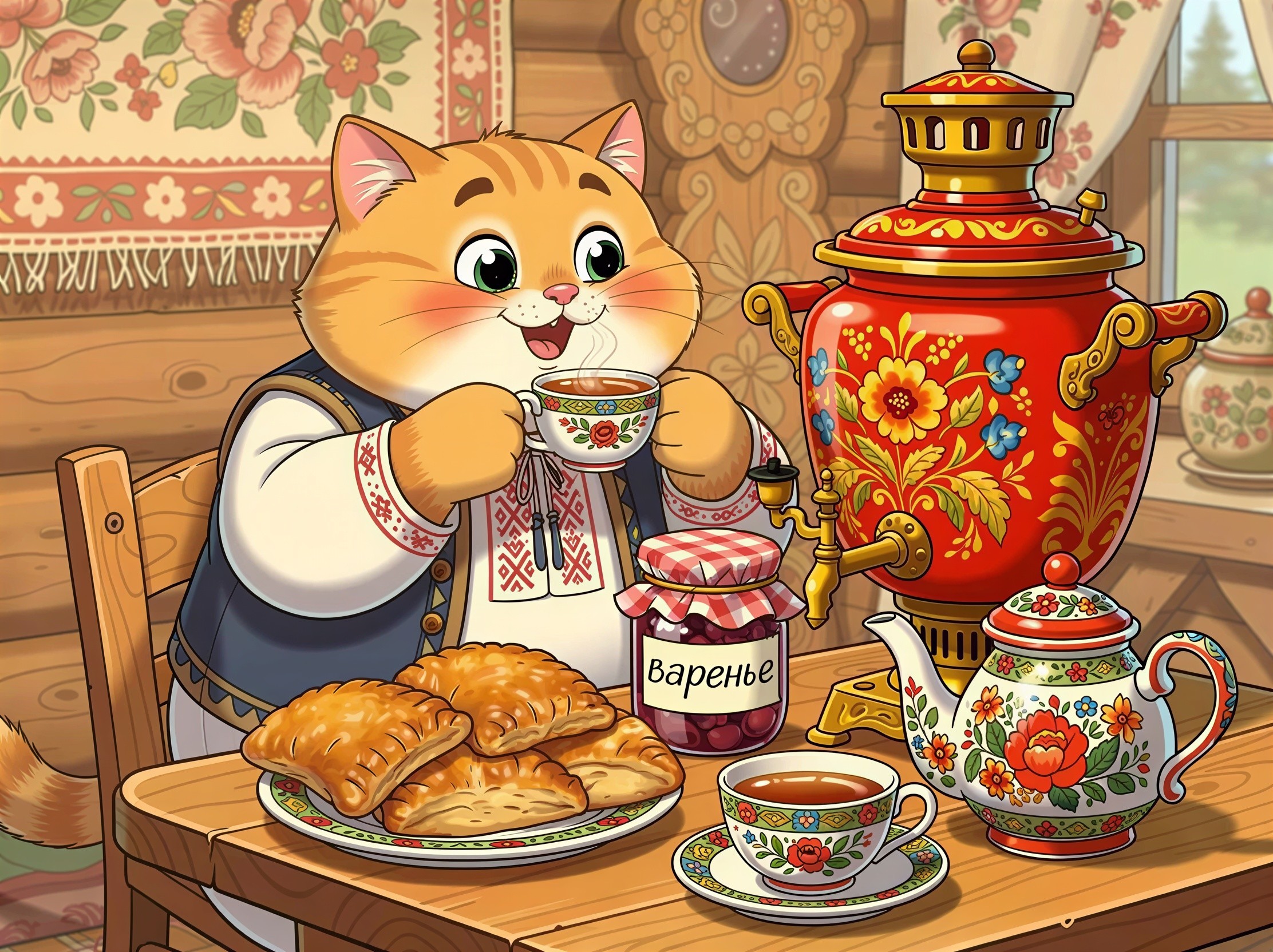 Prompt: Draw a fat cat sitting at a table drinking tea from a cup. On the table there is a Russian samovar, a jar of jam, pies and a tea set. Russian patterns. Cartoon