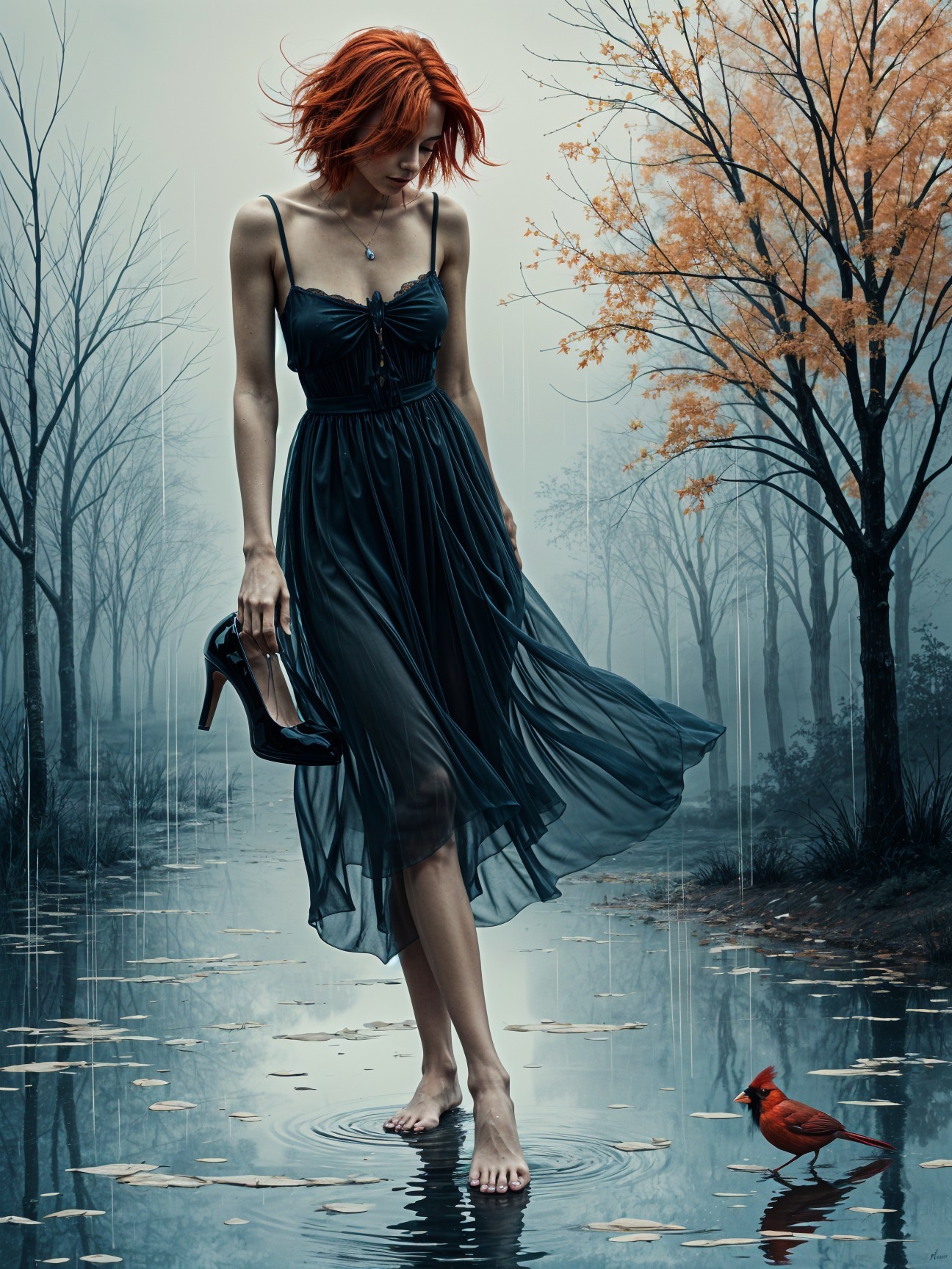 Prompt: A delicate, expressive watercolor painting of a barefoot woman with short red hair walking gracefully through a rain-soaked landscape, exuding strength, vulnerability, and resilience. She wears a flowing, semi-transparent dark blue dress, drenched and clinging softly to her figure. Her long, wet hair cascades naturally over her shoulders. She holds her high-heeled shoes loosely in one hand, as though she has discarded pretense to embrace freedom.