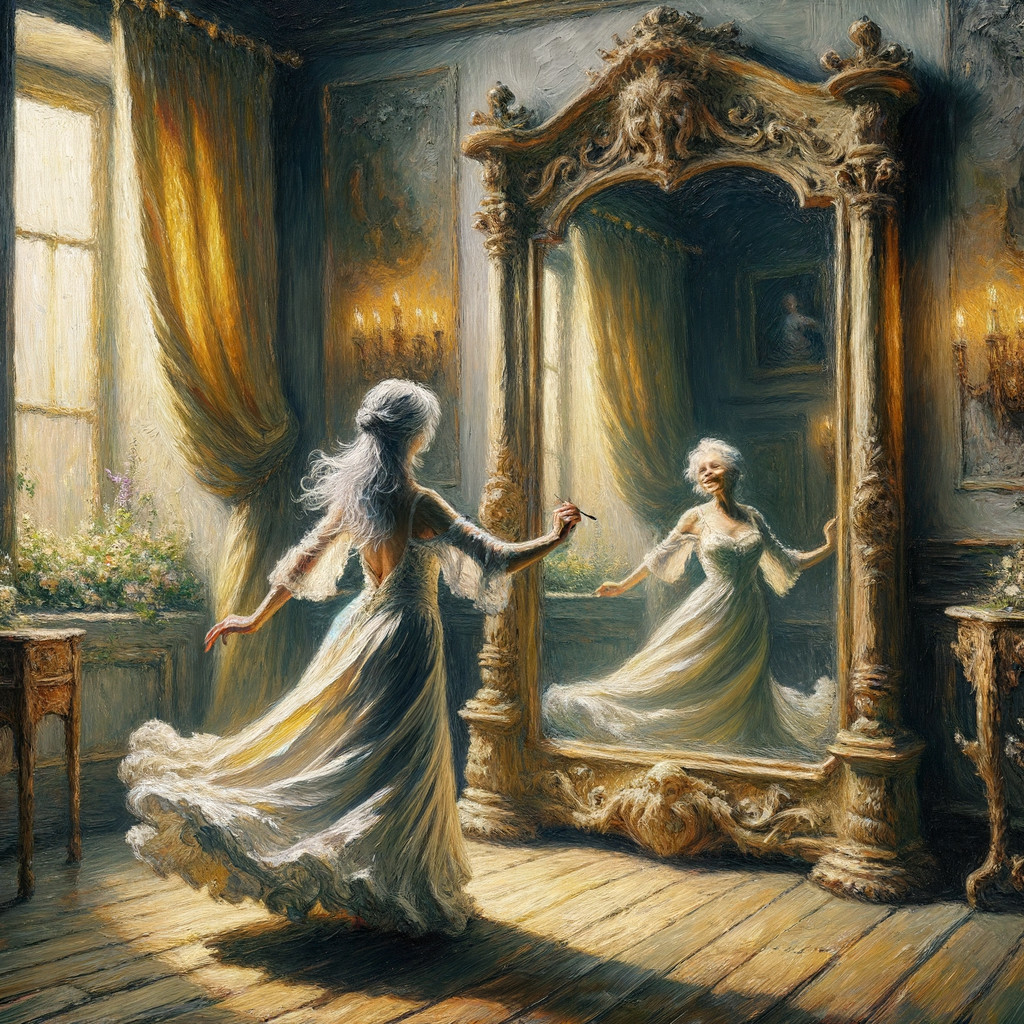 Prompt: A pale woman in a tattered, dark gown stands in the center of a mist-covered moor at dusk. Her long hair falls like wet shadow over her shoulders, her expression calm and sorrowful, eyes deep as drowned memory. In her hand she carries a dim lantern, casting a soft golden glow onto the water where her reflection stretches unnaturally long. Dead trees curl like bones toward the sky, and distant ruined towers fade into fog. The ground beneath her shimmers with shallow water, rippling faintly. The atmosphere is haunting, melancholic, and ghostly — the Woman of the Moor. Style of Shaun Tan × Alan Lee × John Blanche, with soft painterly fog and dramatic lighting.