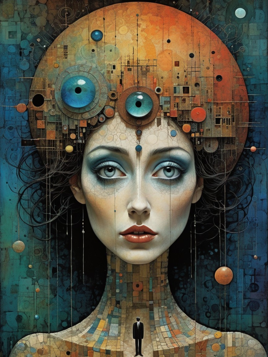 Prompt: ((A masterpiece, creating an amazing science fiction masterpiece)), ((A colossal, steampunk-inspired mobile city traversing a landscape of floating islands. The centerpiece is a massive, tracked vehicle, elaborately constructed with gold, brass, and green-striped panels, adorned with numerous pipes, chimneys spewing white smoke. The vehicle's tracks move across a rocky terrain. Surrounding the mechanical behemoth are various floating islands with structures of their own, resembling cities and aerial platforms. Spherical airships with intricate details drift in the azure sky, populated with miniature buildings and passengers. The overall composition is surreal and fantastical, evoking a sense of wonder and adventure. The color palette blends warm metallic tones of gold and brass with green accents, contrasted against a vibrant turquoise sky. The lighting is diffused, casting soft shadows, with a dreamy, whimsical mood. The artwork style incorporates Art Nouveau and Victorian design influences. The perspective offers a grand view of this mechanical world, accentuating the scale and intricate details of the scene)). Detailed and intricate artwork blending elements of fantasy, surrealism, and futuristic themes. The image should evoke a sense of wonder and awe, utilizing techniques reminiscent of watercolor. Patchwork style of Tomasz Setowski, Jean-Baptiste Monge, Hayao Miyazaki, H.R. Giger, Catherine Abel, and Paul Klee. Use stunning color oil drawing.